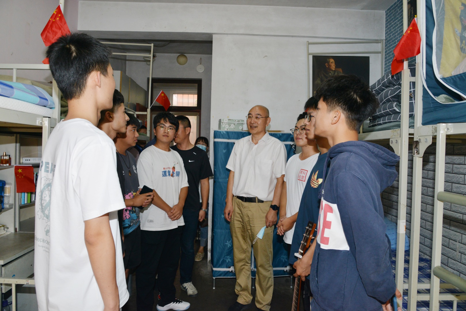 在与陈克正校长离别之际,同学们自发邀请与校长共同合影留念。住在南苑五号楼107宿舍的段昊轩同学表示:“从西北甘肃来到东部沿海,步入校园的一个月以来,深切感受到学校的关怀,自己和同宿舍室友也加入了学院不同的体育协会进行锻炼;同时理解学校因防疫调整的放假安排,会积极配合做好防疫举措,度过一个愉快的假期。”来自新疆担任宿舍长的退役学生守库尔表示:“校长及其他领导在百忙之中前来看望我们,大家都感到非常开心,与校长的交流过程也感到非常亲切,自己将把在军营锤炼的意志品格传递给大家,带领同学们积极参与体育运动,服务好班级同学,谨记校长嘱托,实现全面发展。”