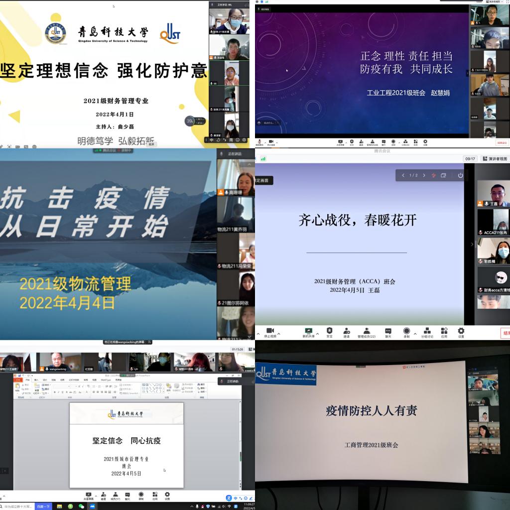 本次主题班会的主要内容是疫情防控知识的普及和学生学业的指导工作。各专业班主任利用“钉钉”“腾讯会议”等网络平台,结合各年级学生特点和需求,主要围绕三个方面的内容展开:一是坚持思想引领,强化责任担当。各专业班主任带领同学们学习了学校与学院疫情防控有关文件,同时结合近期高校防疫出现的学生案例进行了剖析。要求同学们要严格遵守有关法律法规和学校防疫要求,做到不信谣、不传谣,坚持信息提报,做好核酸检测。各专业班级骨干、宿舍长要切实发挥组织员、引导员、宣传员的先锋作用。切实关注同学们宿舍舆情及上课情况,做到及时向辅导员老师反馈,及时提醒同学们需要注意的不自觉、不自律行为。二是关注学生心理,宣传防疫知识,教育引导同学们平和面对由疫情引发的封校管理举措。包括新型冠状病毒肺炎的“症状及识别”“主要传播途径”和“科学自我防护”等方面对全体学生进行相关知识普及。号召在学习之余走下网络,走向操场等场合,选择积极健康的文体活动,培养良好的兴趣爱好。采取三是聚焦学生主责主业,突破时空限制实现学习新模式。各专业班主任结合近期线上上课情况,引导学生合理安排学习生活,增强自律意识,做到无论是在教室,还是在宿舍都能严格要求自己。同时班主任老师们强调加强线上考勤,并就网课出现的问题进行了梳理。
