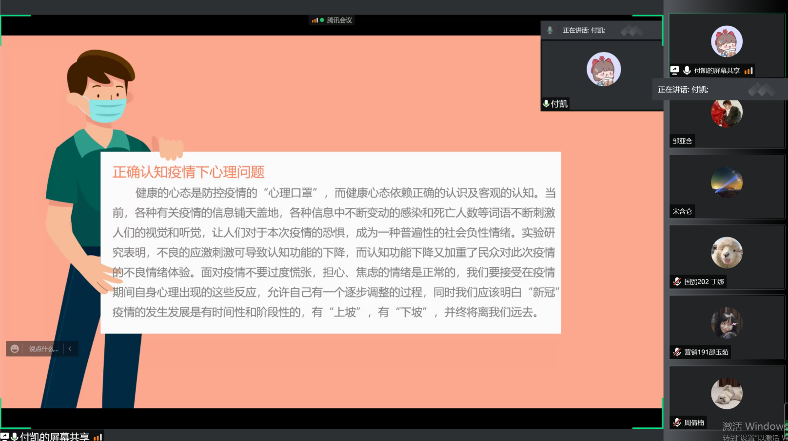 培训会伊始,付凯强调了在疫情背景下大学生心理健康的重要性以及心理焦虑的普遍性。她指出,慌张、担心、焦虑的情绪是正常的,我们要接受在疫情期间自身心理出现的这些反应,允许自己有一个逐步调整的过程。付凯通过科普腹式呼吸法、着陆技术、蝴蝶拍、肌肉放松法、正念疗法等五种心理调适方法,为同学们提供了缓解内心焦虑的有效方法。她表示,健康的心态是防控疫情的“心理口罩”,同学们应保持积极乐观的心态,万众一心做好心理防疫战。