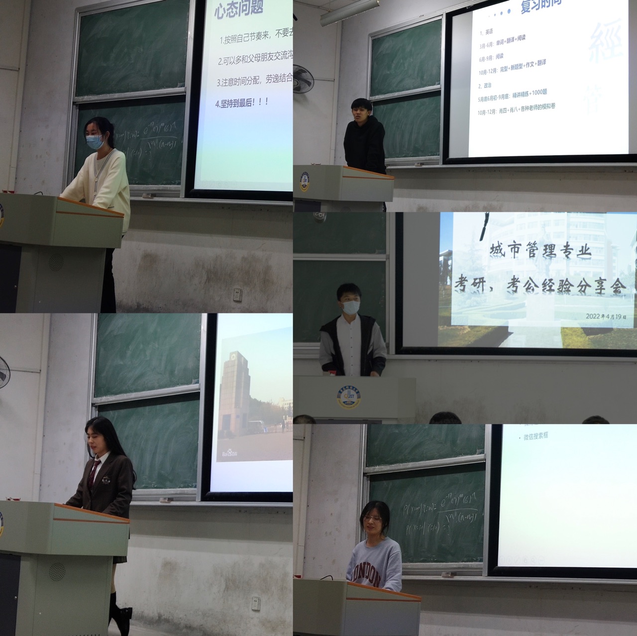 城市管理专业于弘毅E102教室举办 “用努力成就精彩人生——2022届考研考公经验分享会”,本次分享会邀请了2018级考研考公成功的7位同学进行经验分享。分享会由城管系主任万婕主持,城管专业19级、20级、21级共150余名同学参加此次活动。