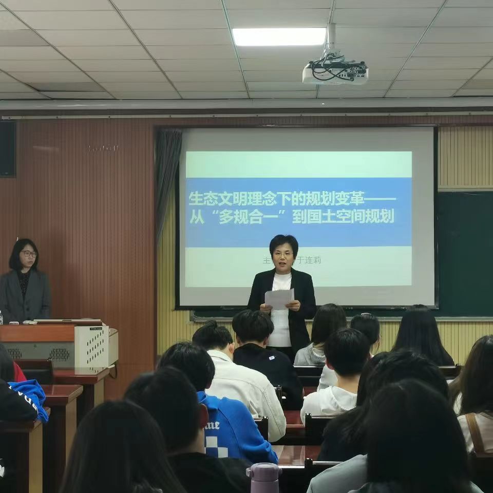 为加强城市管理专业学生对国土空间规划的认识,加深对青岛特色国土空间规划的了解4月28日下午,城管系特邀请青岛市城市规划设计研究院编研中心、市国土空间规划智能仿真工程研究中心、市国土空间规划数字设计服务技术创新中心于连莉主任作题为“生态文明理念下的规划变革——从‘多规合一’到国土空间规划”的专题讲座,城管系主任万婕老师主持本场讲座。