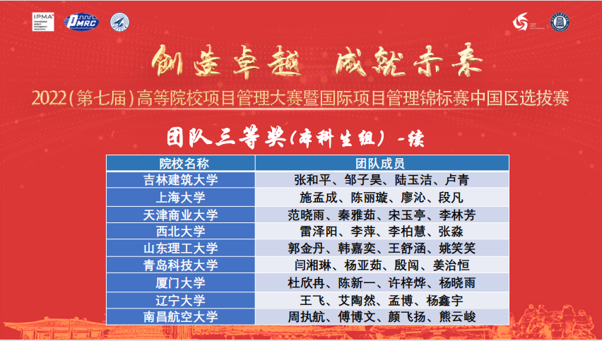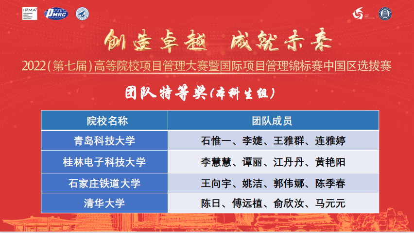 、西北工业大学、桂林电子科技大学、中国石油大学(华东)、石家庄铁道大学、北京邮电大学、北方工业大学、清华大学、昆明理工大学、北方工业大学十支团队(分别有本科生组和研究生组),进入英文资格预选赛,具备条件的,将作为中国代表队参加国际项目管理锦标赛。