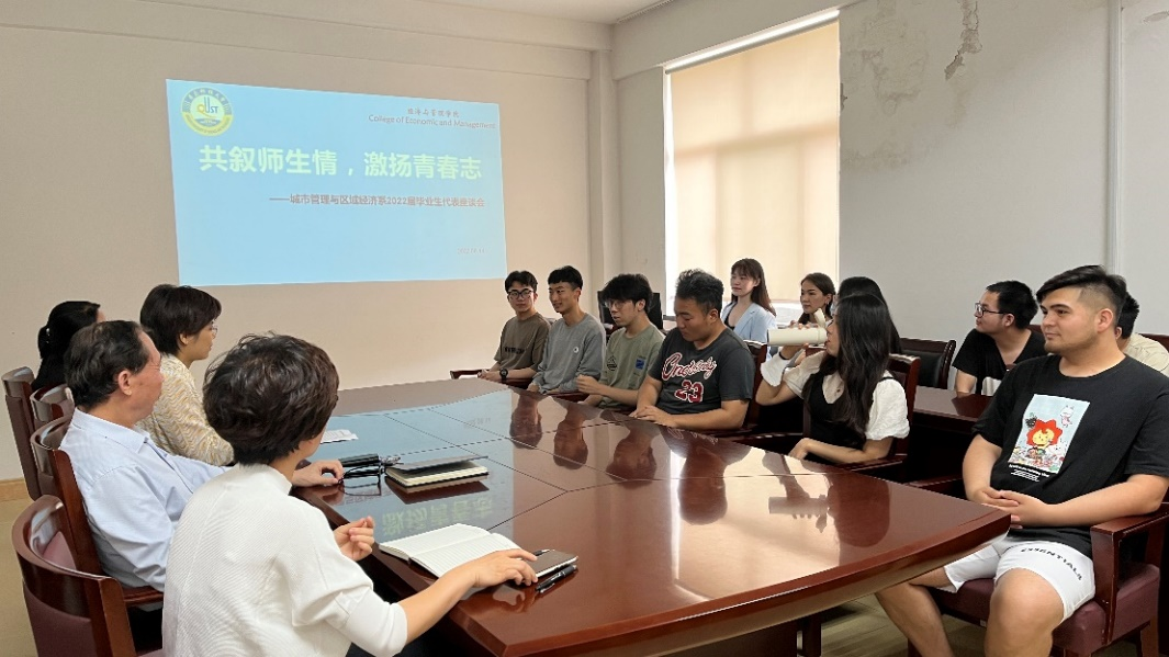 城市管理与区域经济系于经管楼501会议室开展“共叙师生情,激扬青春志”2022届本科毕业生座谈会。党委班子成员联系支部领导宫攀,城管系教师代表及2022届毕业生代表参与座谈会。座谈会由系主任万婕主持。