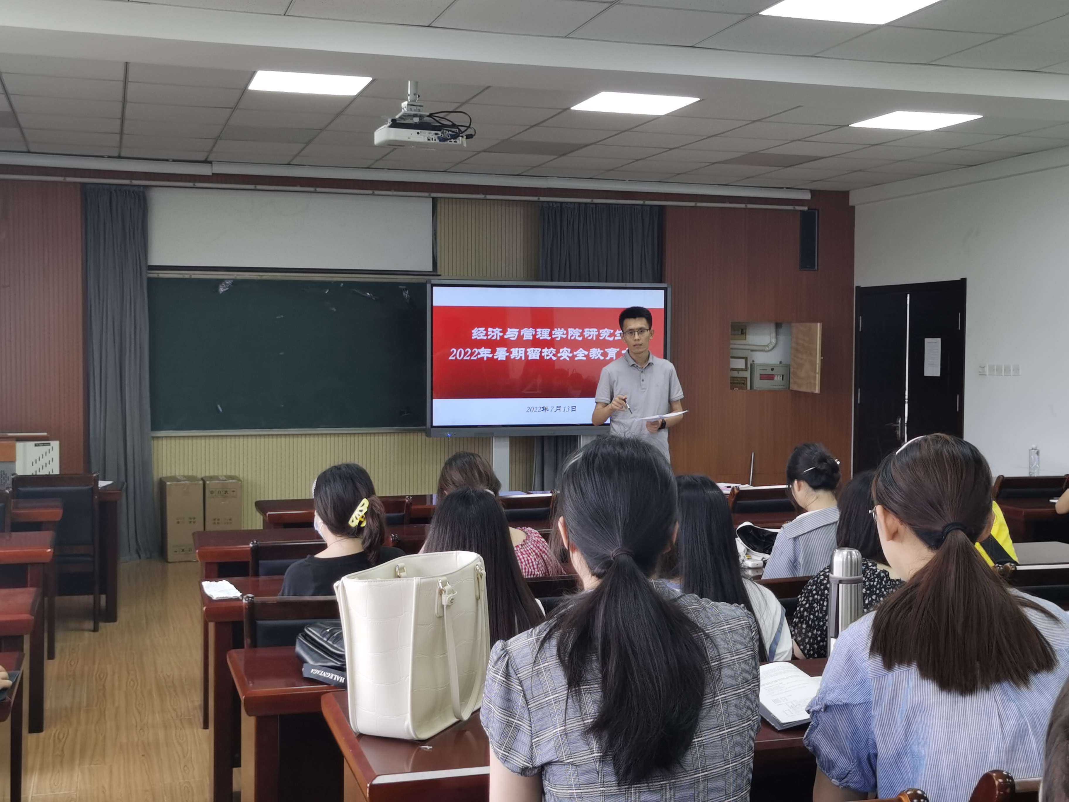 在经管楼504会议室召开研究生2022年暑期留校安全教育大会,学院全体留校研究生参加会议,会议由学院学工办副主任兼团委副书记张显全主持。