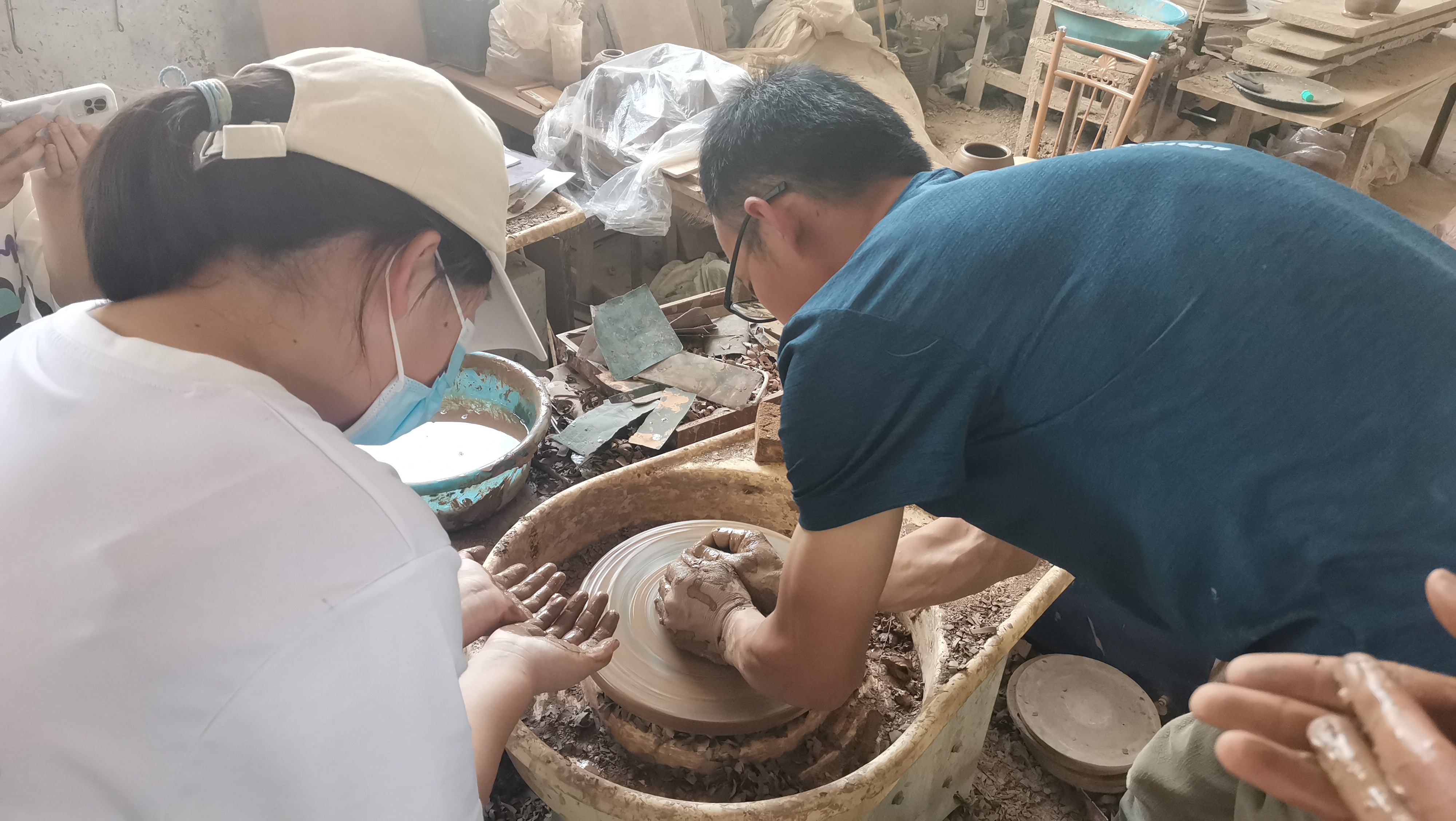 在孙连伟老师的指导下,团队成员体验了黑陶最初的拉胚成型过程。双手沾水润湿,轻抚着拉胚机上细腻、润滑的陶泥。脚踩踏板,体验手中陶泥旋转时的快感。通过孙老师的帮助,队员手中的泥坯逐渐成型,变幻多样,一时间心中的成就感油然而生。每个人都很认真去对待自己的作品,对待这项艺术。静下心来去做这样一件可以陶冶情操的事情,是我们在乏味的生活中的不多的乐趣。我们用心去感受制作的过程,去拿捏每一块胶泥,轻抚每一个图案。制作过程中队员们也深刻感受到黑陶制作过程的艰难,感悟到大师们的工匠精神,真正领略黑陶工艺的风姿与魅力。