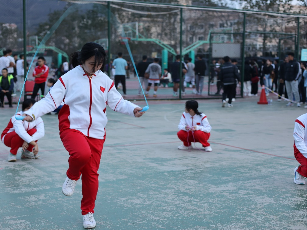 的健儿们统一着装,整齐候场,面露必胜的自信。他们上场时毫不露怯,迈着自信的步伐进入场地,只听绳子嗖嗖的声音在他们耳边呼啸而过,打在地上啪啪直响。在赛场上随着音乐的旋律,跳动着“青春跃动”,挥洒着专属于青春的汗水。在他们自信的背后是刻苦的训练,付出最大的努力,调整状态。证实了“无论做什么事情,只要肯努力奋斗,是没有不成功的。”