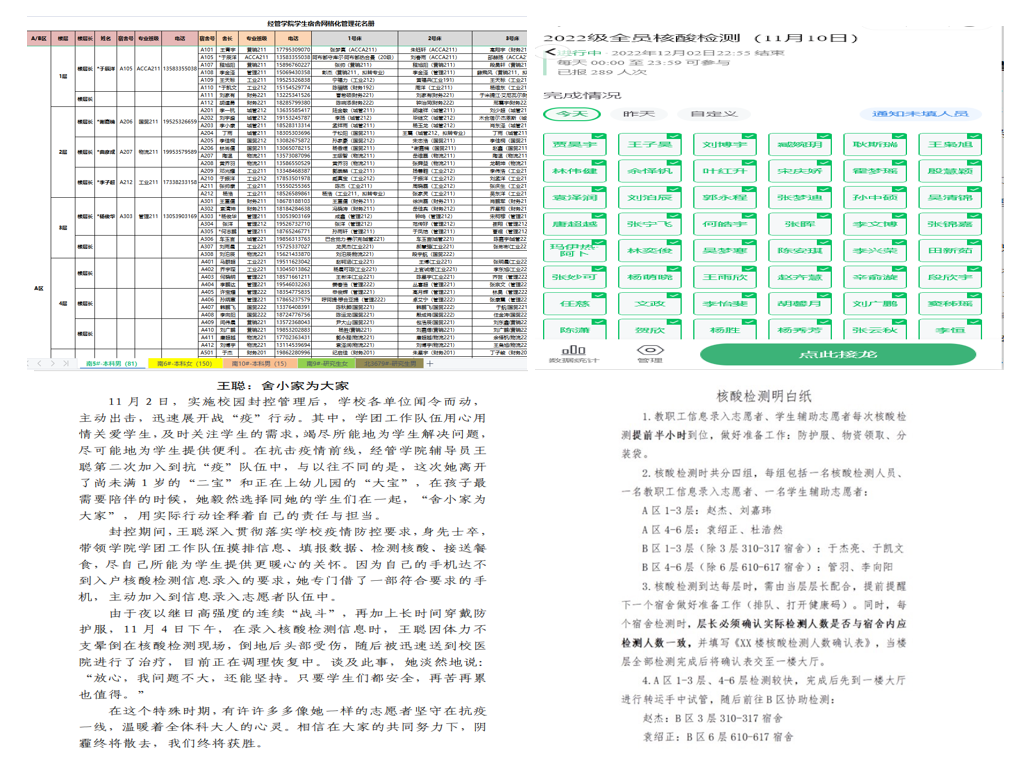 迅即响应,根据学院常态化学生宿舍网格化管理体系,设置楼长、层长、舍长三级网格化管理联络机制,落实监督责任,持续做好学生的静默管理工作,确保不同宿舍学生人员避免出现交叉情况;规范核酸检测流程,制定《核酸检测明白纸》,创新使用“群报数”小程序,每日核酸检测后学生需上报“核酸检测标识”,各年级、各专业由专人负责每日核查,层层压实责任,确保核酸检测不漏一人。