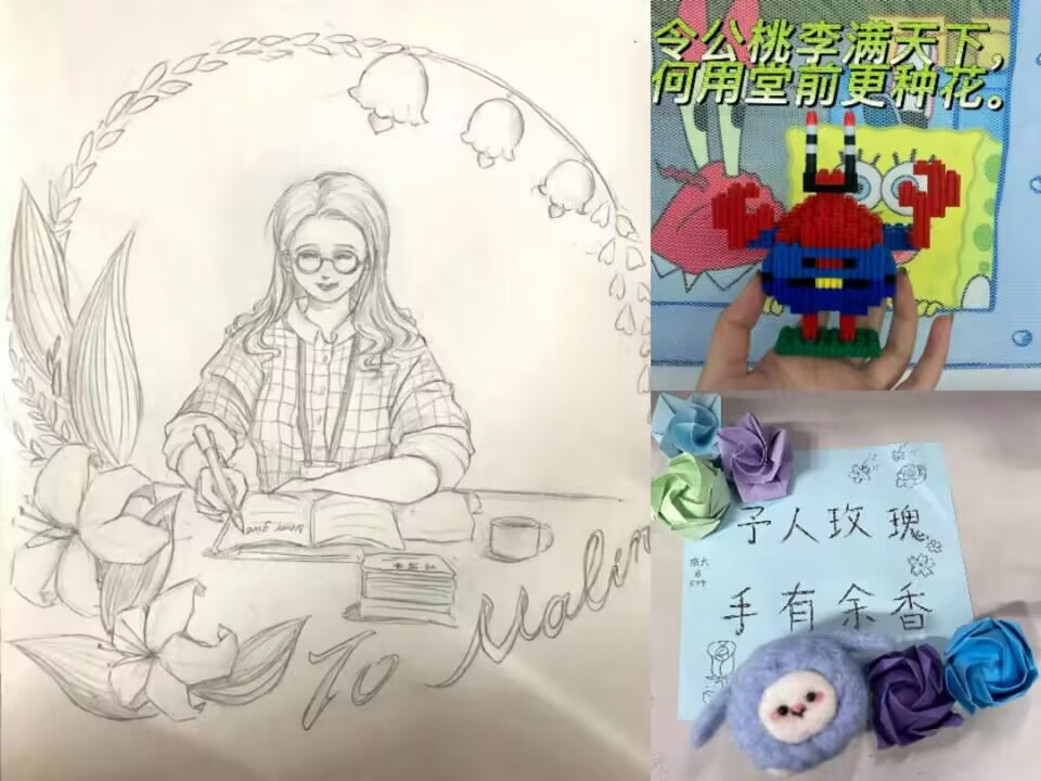 在“传师情,表师意”的绘画活动中,经管学子在纸上绘画出自己心中老师的样子并写上自己对老师的真挚问候,拉近了同学与老师之间的距离,同学们以笔传情通过文字诉说着对老师的感激,用真挚的问候表达自己拳拳报师恩之情。“桃李芬芳,手工传情”手工活动中,同学们为老师送上亲手制作的手工艺品,展现出单纯美好的师生情谊,加强了师生之间的交流。