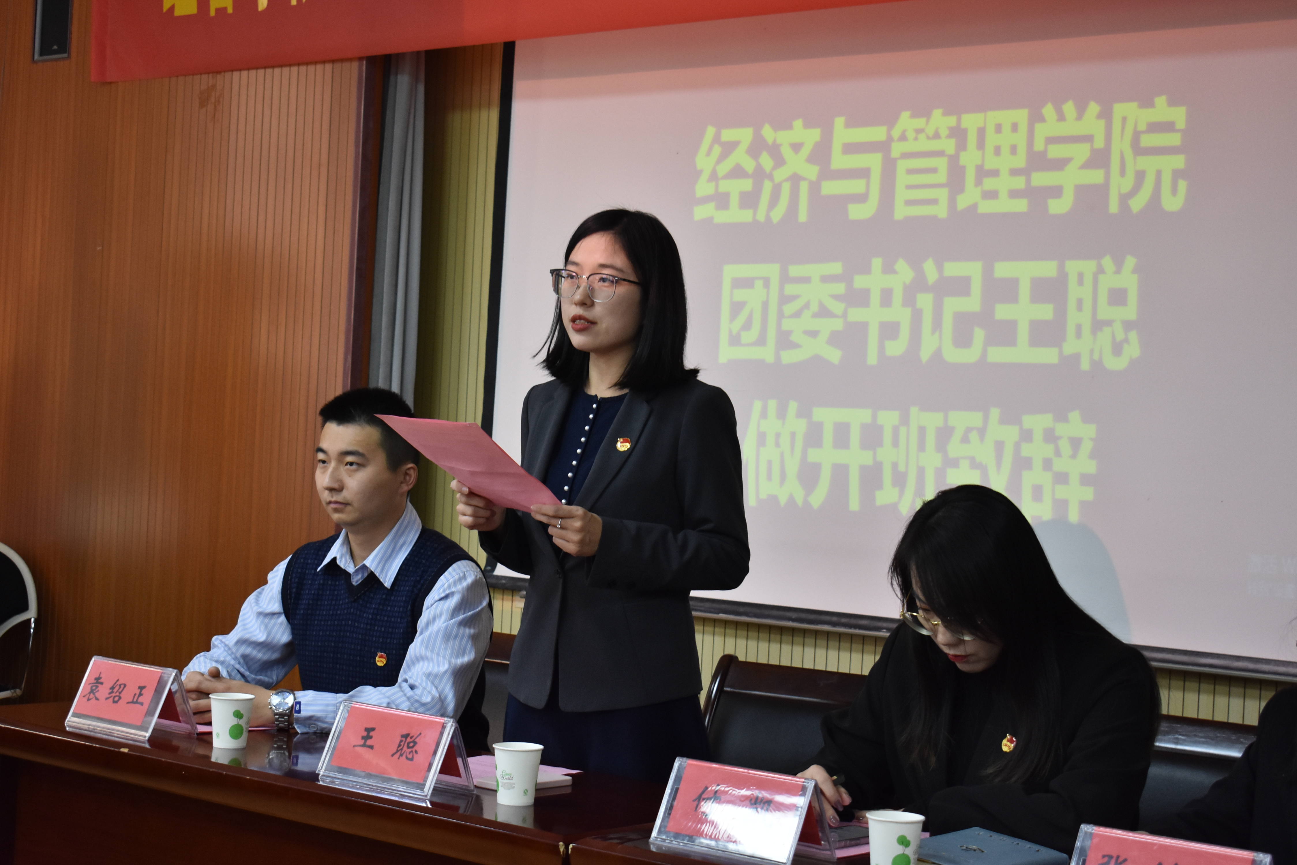 开班仪式在庄重严肃的国歌中会议拉开序幕。首先,学院团委书记王聪为此次仪式作开班致辞,王聪代表院团委对学院青马工程培训班的顺利开班表示热烈祝贺,并对学员提出三点希望:一是充分认识新形势下在高校开展“青马工程”的重要意义;二是在理论学习中坚定理想信念,做马克思主义的信仰者、践行者;三是珍惜学习锻炼的机会,争做有理想、敢担当、能吃苦、肯奋斗的新时代好青年。她鼓励学员们将理论学习与实践相结合,将短期培训与长期学习相结合,以培训为起点,发挥先锋模范作用。