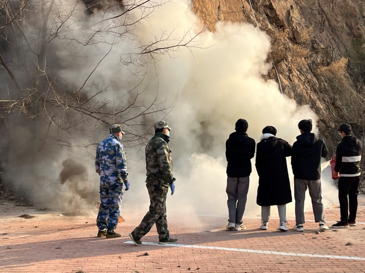 赵淑东老师首先讲解了消防安全应急知识与灭火器使用技巧,在发生火情时,如何正确地扑救、自救和逃生。随后由师生们自己动手实践,练习使用灭火器灭火。本次演练所用灭火器为干冰灭火器,师生们拨出插销,一手握住开启压把,另一手握住喷射喇叭筒,对准火源喷射,将火源迅速扑灭,两人一组完成灭火器使用的练习。