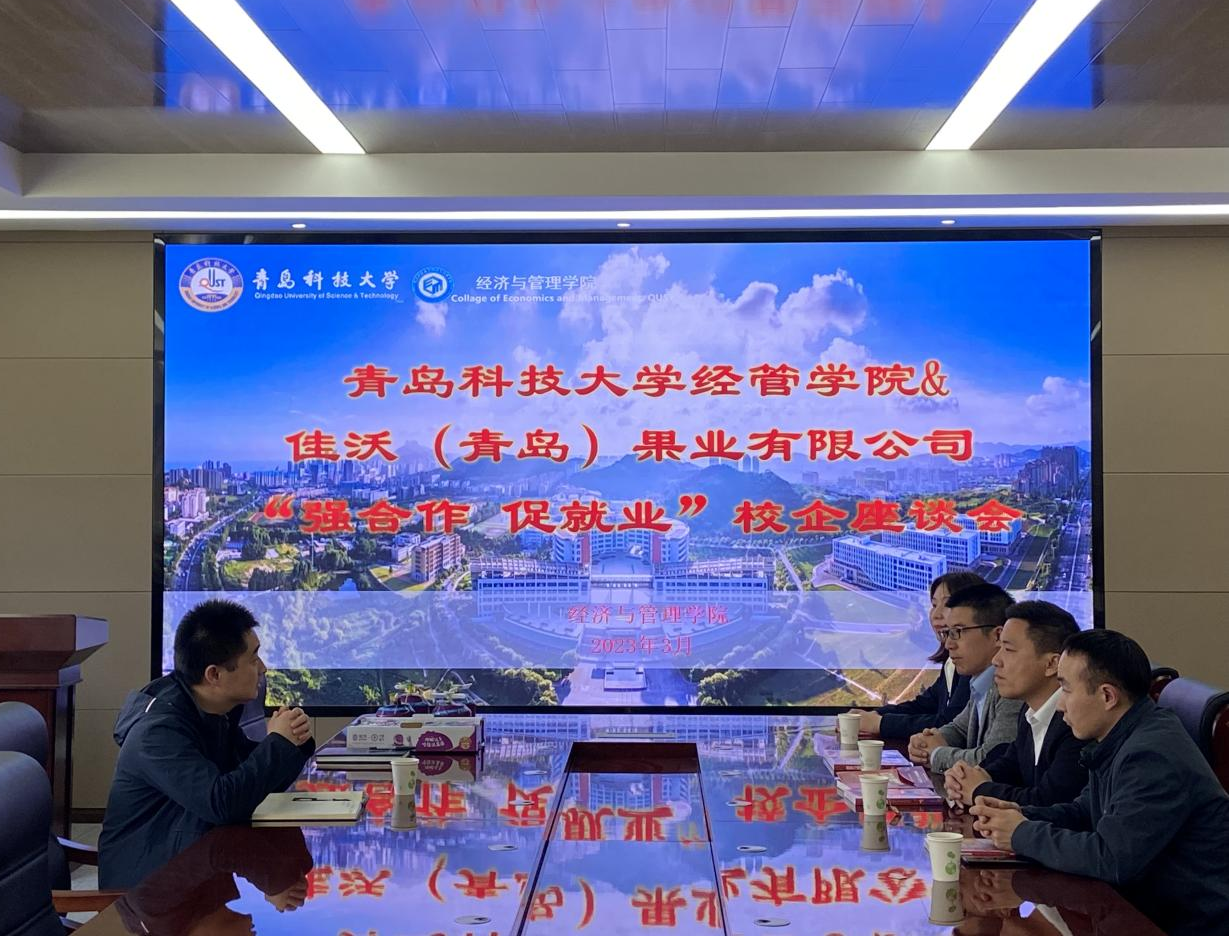 于经管楼313会议室举办“强合作 促就业”校企座谈会,佳沃(青岛)果业有限公司华北大区人力资源经理客纪维、山东区域经理杨闯一行4人来校交流,探讨人才招聘、实习实践等相关事宜。xvideo