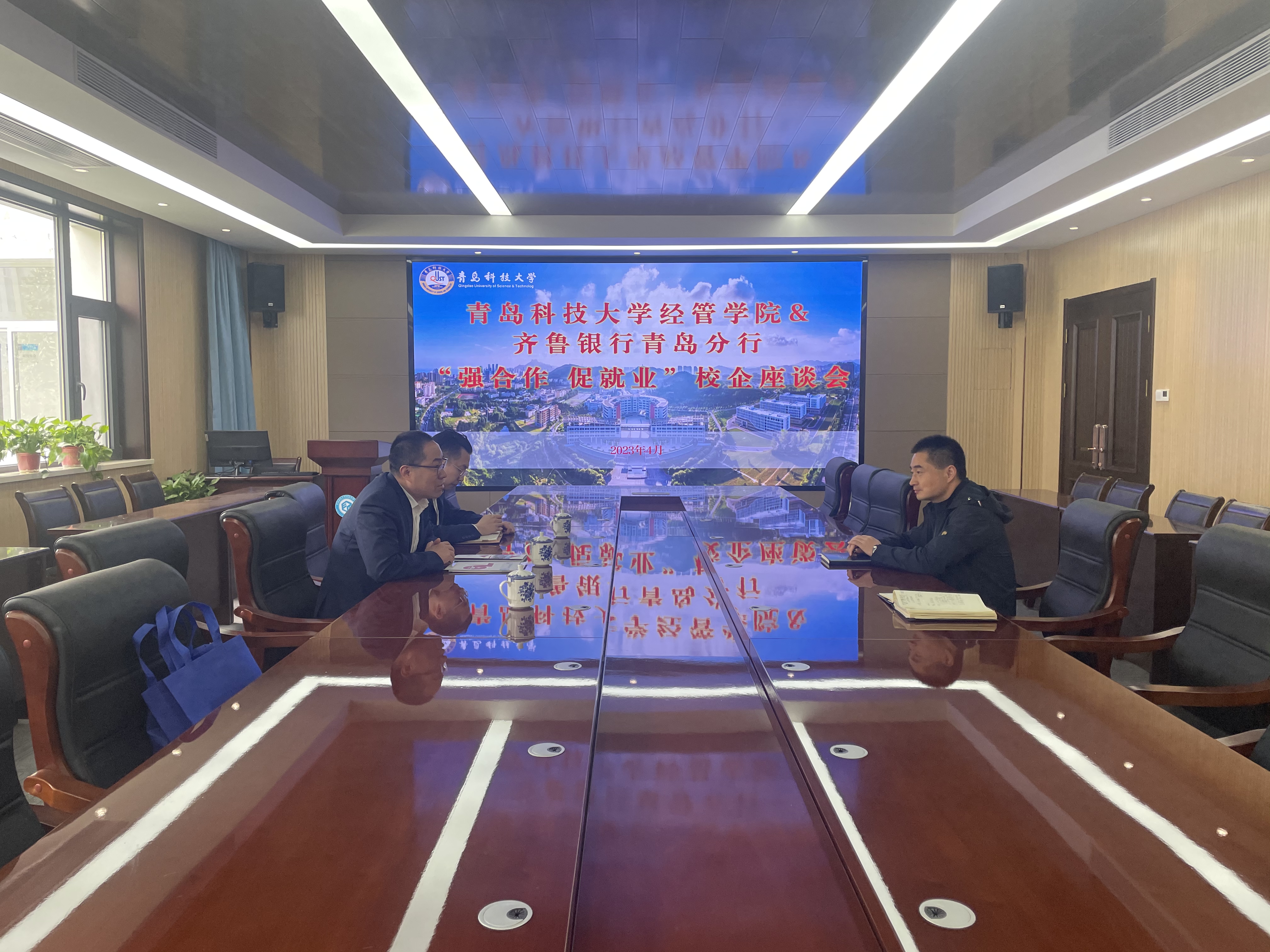 与齐鲁银行青岛分行于经管楼313会议室举办“强合作 促就业”校企座谈会,齐鲁银行青岛分行办公室主任兼计财部总经理刘玉浩一行3人来校交流,探讨人才招聘、实习实践等相关事宜。学院党委副书记兼副院长牛宝卫、2023届毕业生辅导员孙一君参加座谈会。