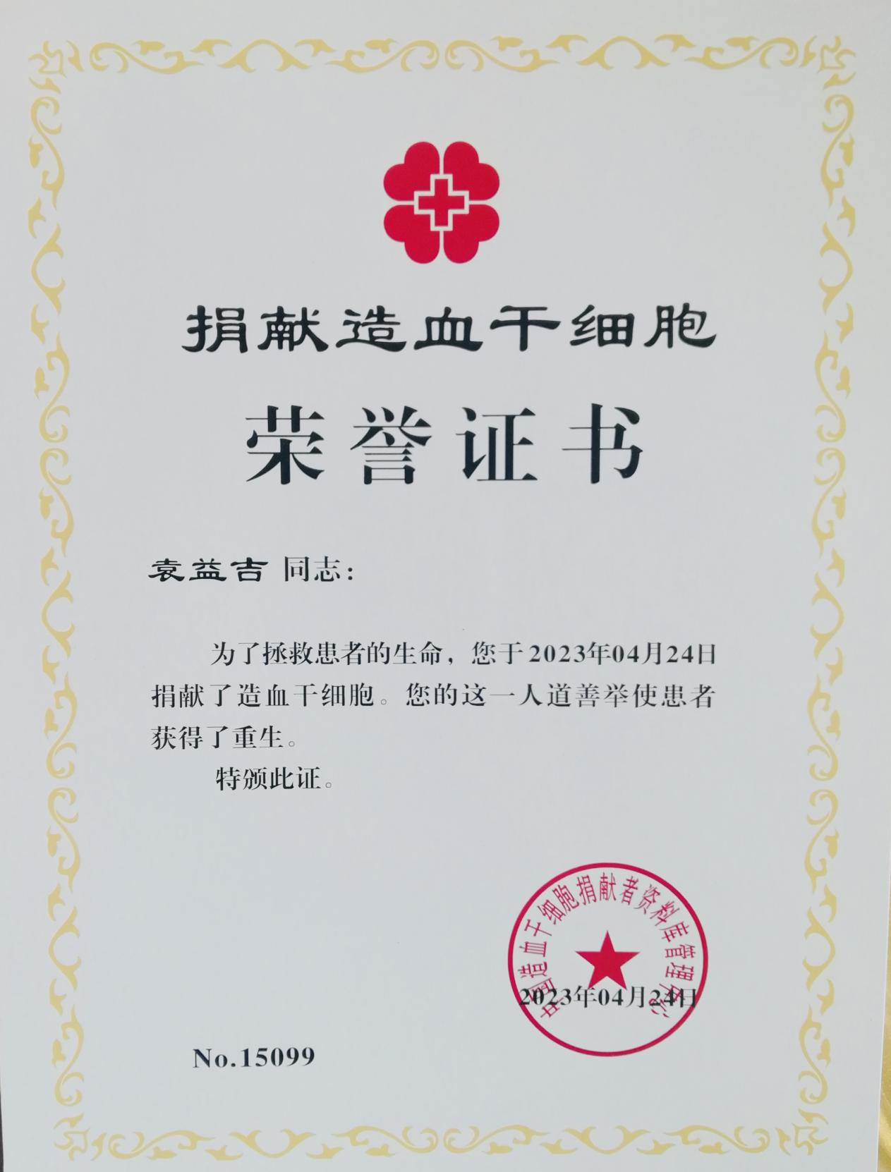 2019年4月,袁益吉在进行无偿献血时,得知捐献造血干细胞可以挽救白血病患者生命时,主动提交了申请,采集血样后加入中国造血干细胞捐献者资料库,成为一名捐献造血干细胞入库志愿者,2023年3月,接到与白血病患者配型成功通知后,袁益吉没有丝毫的犹豫同意捐献,袁益吉说:“能通过我,挽救白血病患者生命,是我义不容辞的责任!”他表示,从上个月起,就开始保持良好的作息规律,每天慢跑一个小时,尽量保持饮食清淡,不再吃辛辣的事物,尽自己所能把身体调整到最好状态,让患者早日得救。据悉,这是我校第三位捐献造血干细胞的同学。