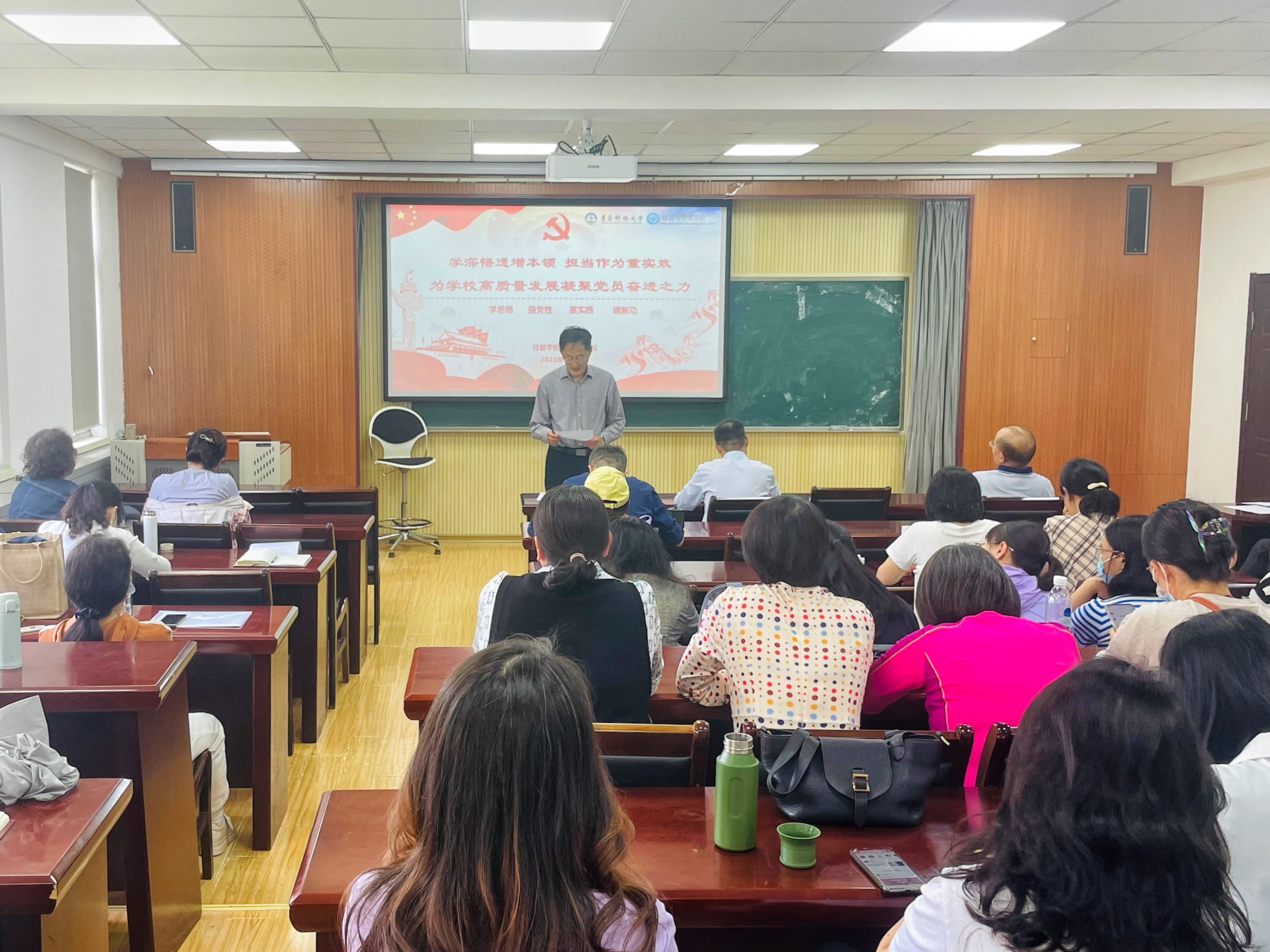 在经管楼419会议室组织开展立德树人大讲堂之教师党员专题培训会,学院党委书记李德成主持会议,学院院长李勋来作师德师风专题思政课,全体教职工参加会议。