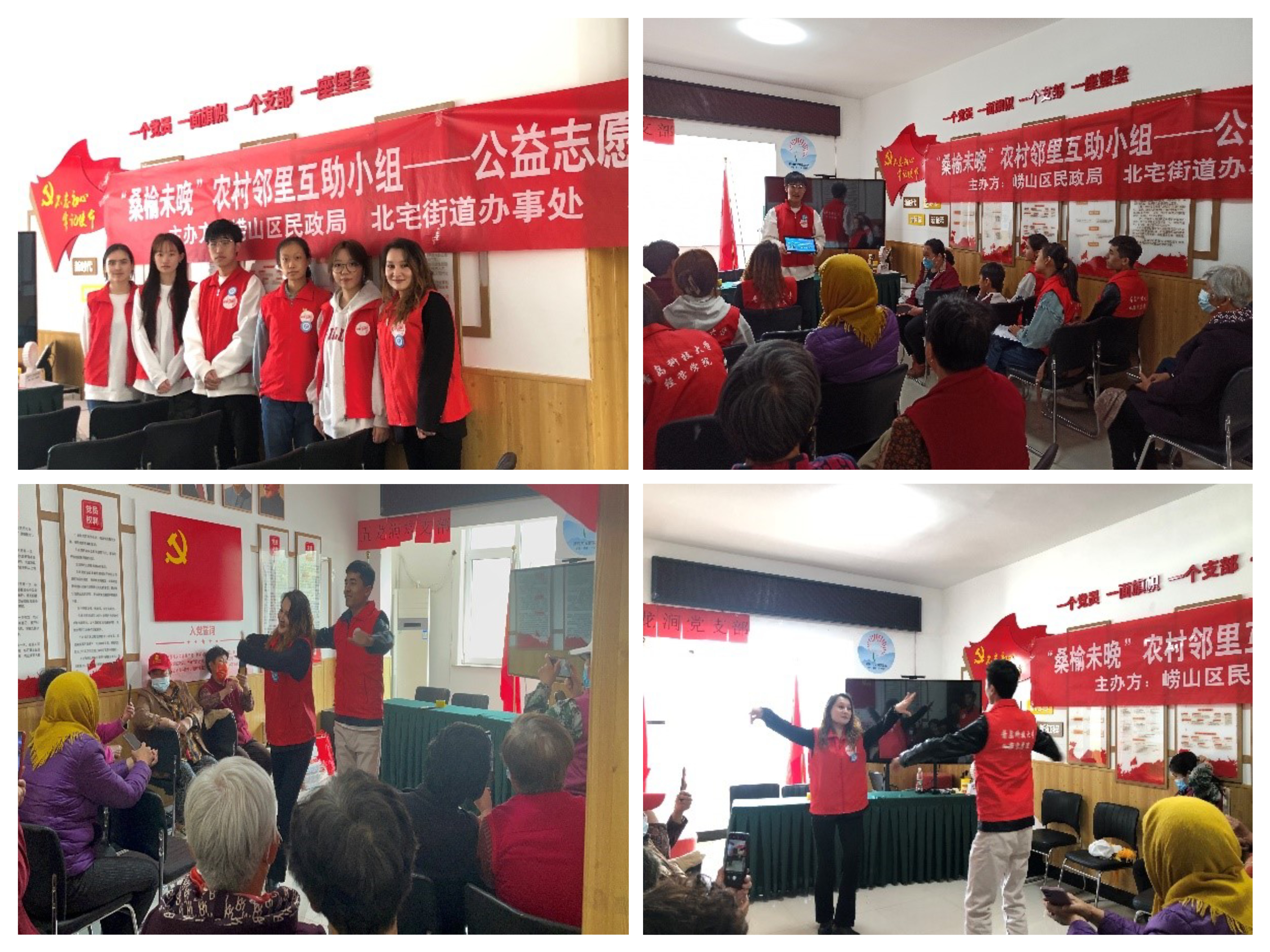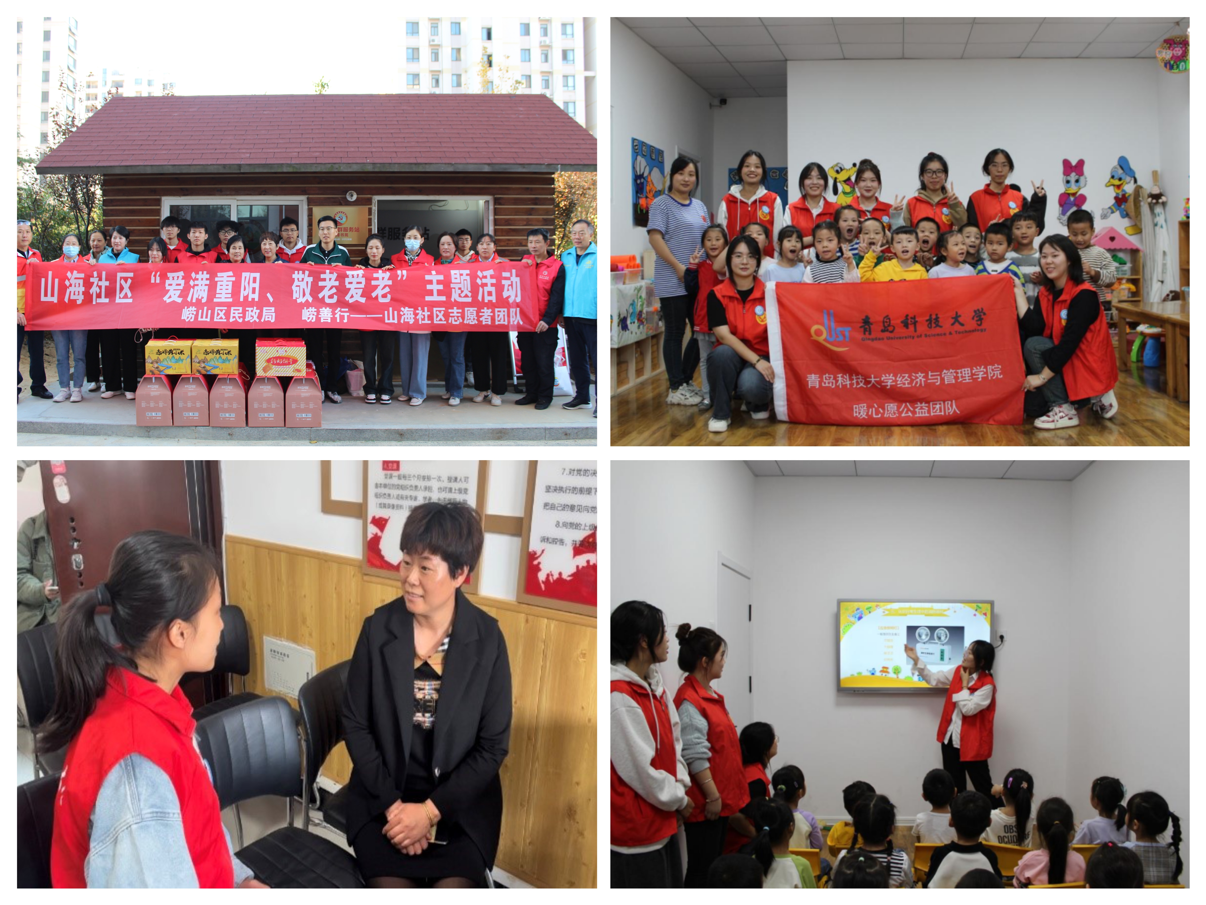 深入挖掘人文资源,推动社区实践活动落地见效。以国庆节、儿童节、重阳节等节日为契机,积极发动大学生志愿者,依托暖心愿爱心公益协会等学院组织,通过与崂山区山海社区结对,聚焦一老一小,为老人带去文艺节目、防诈宣传,为孩子开设暖心课堂,共读一本书,夯实社区团力量,满足社区群众个性化爱好,引领人文关怀入大家。让青年学生有社区发展治理的“旁观者”转变为“参与者”,引导学生在实践中受教育、长才干、作贡献,加深对群众的感情,增强责任担当意识,进行自我教育、政治引领。