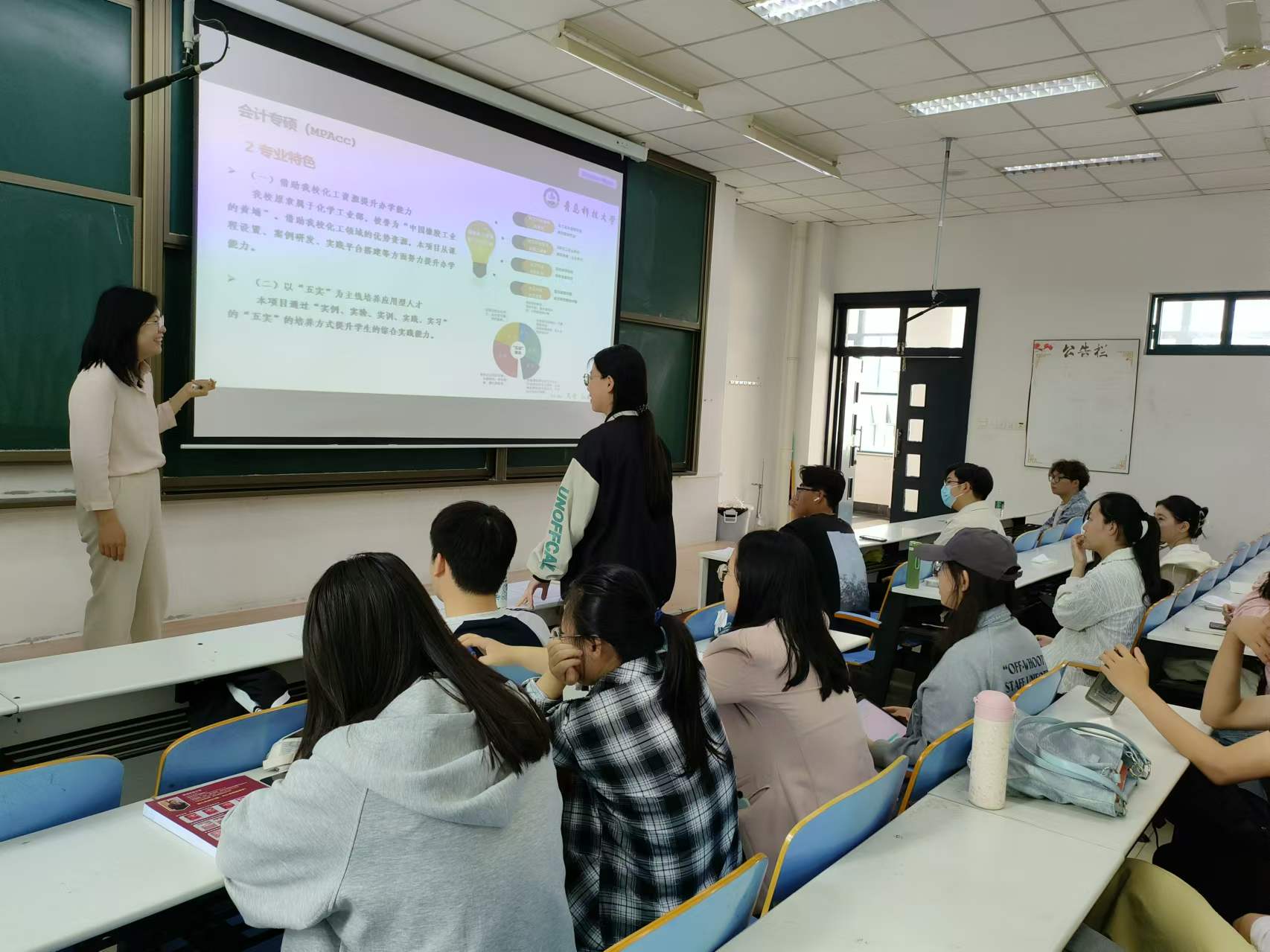 研究生招生宣讲团成员MBA教育中心马燕老师详细介绍了学校以及学院的发展情况、学院招生优惠政策、学院各研究生招生专业的基本情况、专业特色和近三年的录取情况。