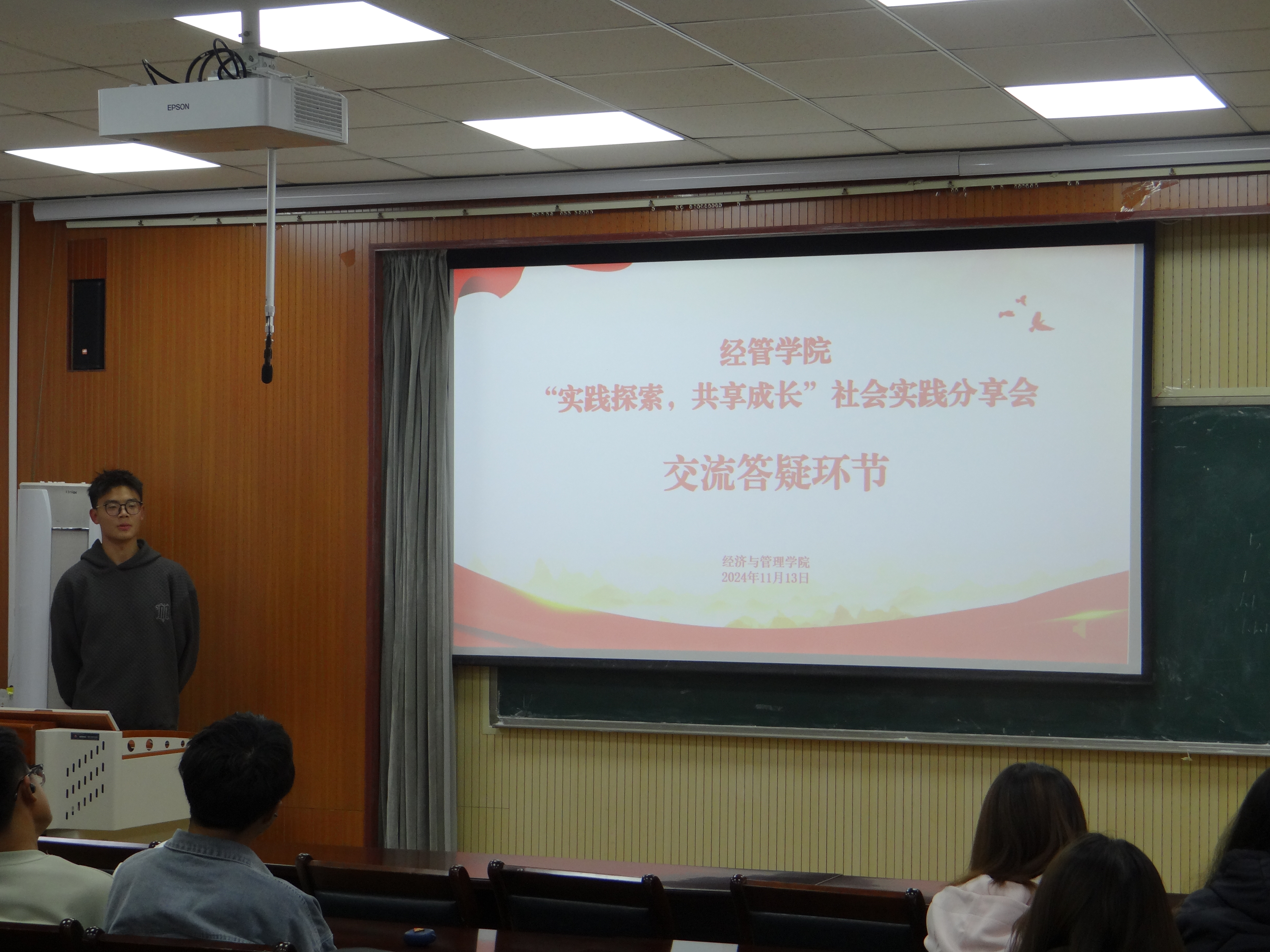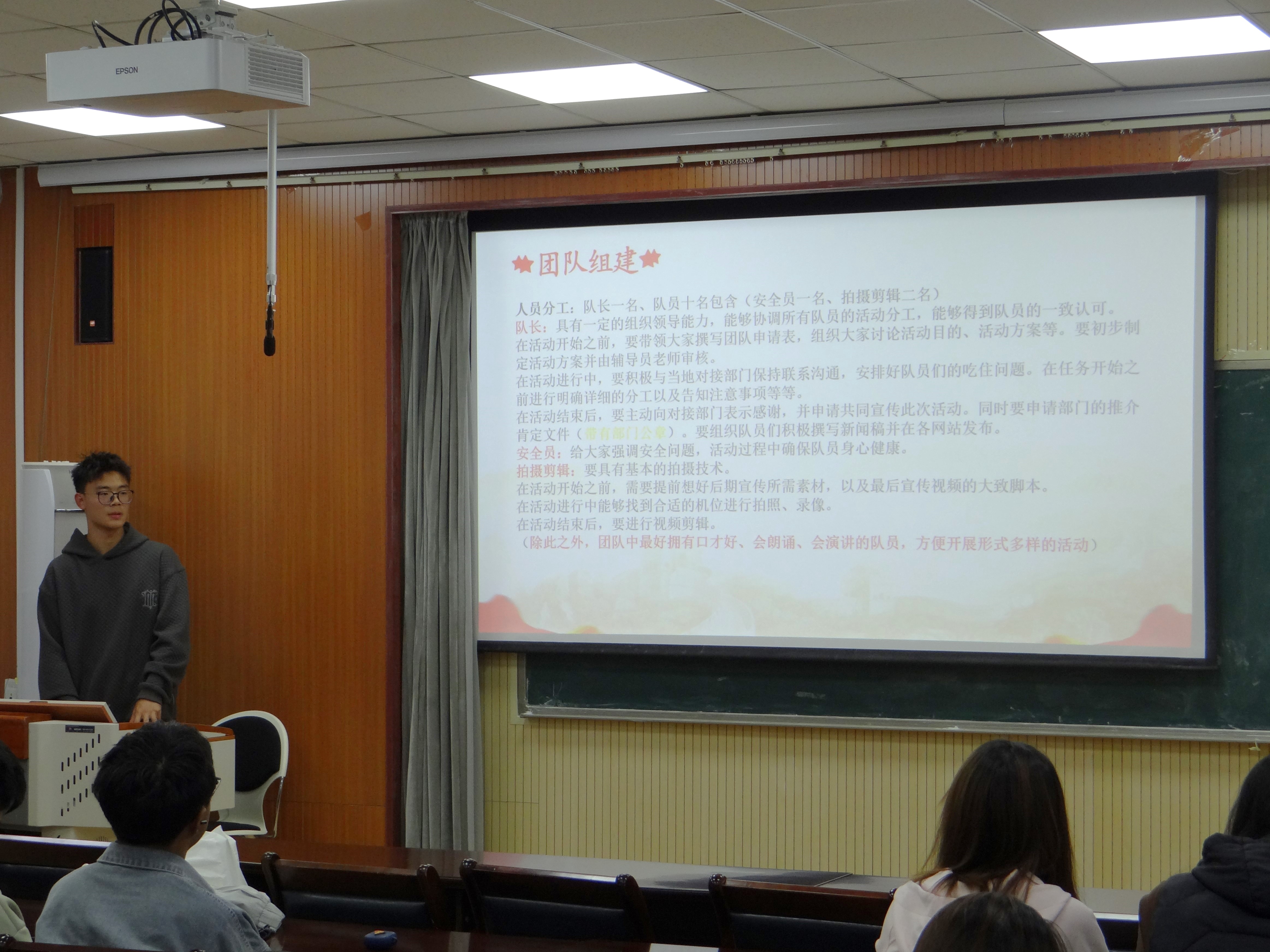 国贸专业的闫广振从三个方面分享了实践活动的获取渠道、流程以及方式方法等,鼓励学生多方面去参与实践活动,提升自我实践能力,肩负起为中国式现代化挺膺担当的青春责任。国贸专业的孙雨辰结合自身经验,从团中央专项活动的申报到如何开展进行详细的解答,她就申报时间、前期准备、申请技巧等进行了详细梳理,为同学们后续实践活动的开展描绘一幅清晰的蓝图。物流专业的牛志强就活动规划、团队分工协作以及后续的成果推广进行深入的讲解和剖析。基于自己对实践活动的深刻理解和切实的实践经验积累,做出极具针对性与专业性的指导,为同学们对实践活动的深度理解打开新视野。