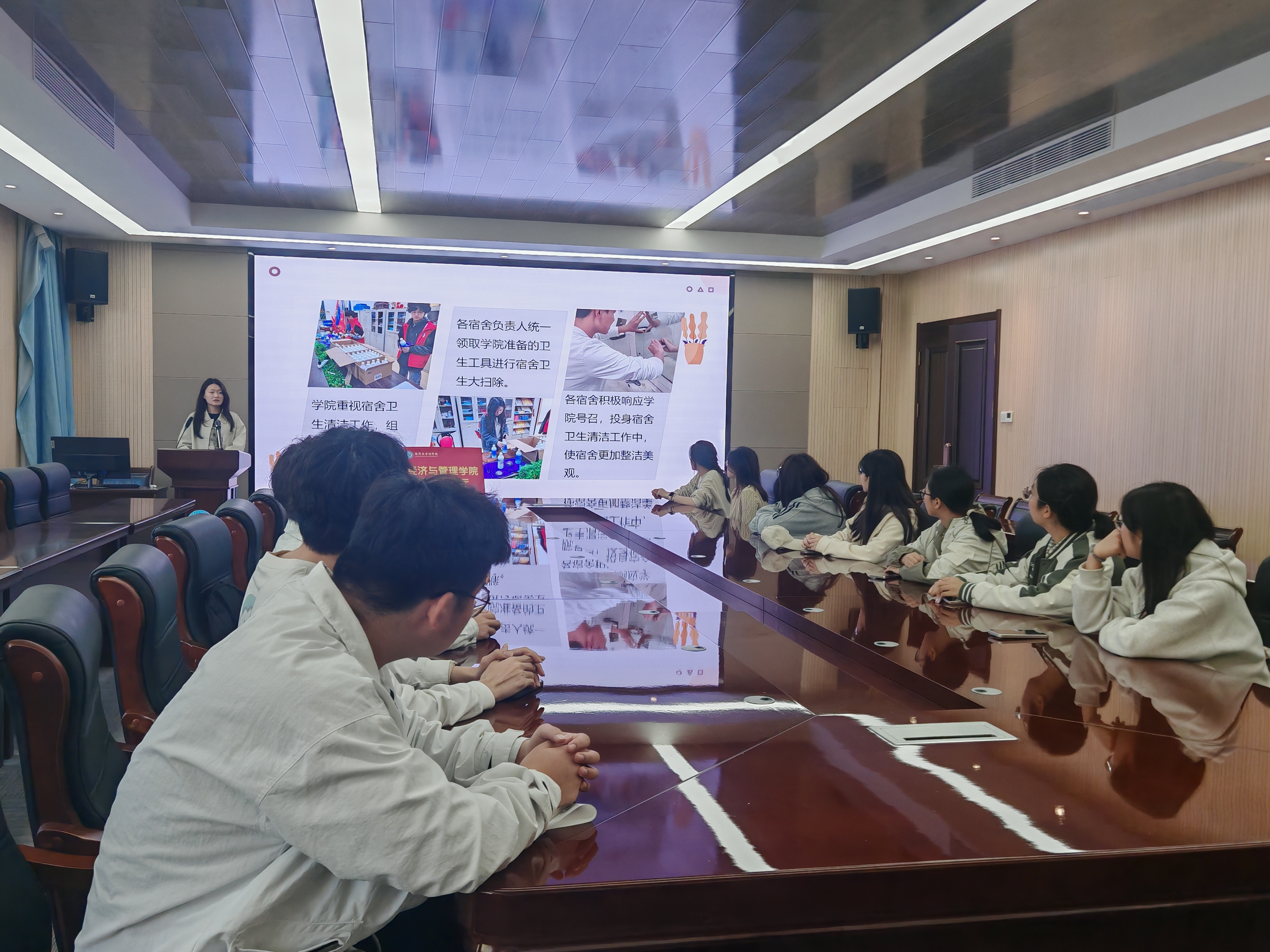 活动伊始,权益部负责人武芳竹围绕近期宿舍建设工作进行了全面总结。目前,学院将宿舍文明建设作为重点任务进行开展,围绕日前发布的“1234N‘经’治宿舍”建设计划和学生成长“共同体”实施方案落实实施。