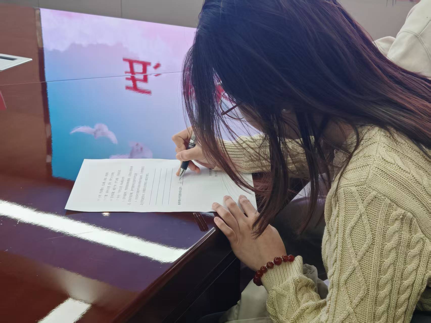 仪式最后,进入“经”治宿舍建设标杆责任书签字环节。武芳竹宣读了《“经”治宿舍评比活动责任书》,并分发给各申报宿舍舍长,各舍长在责任书上写下文明宿舍建设意见并签字。责任书明确了宿舍在卫生、安全、文化建设等方面的责任与目标以及评选的标准和规则,标志着学院对宿舍管理的进一步规范与重视,激励着各宿舍向更高标准迈进。