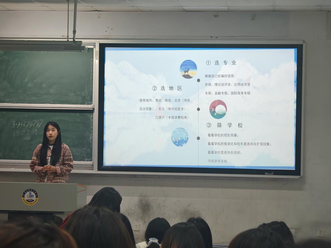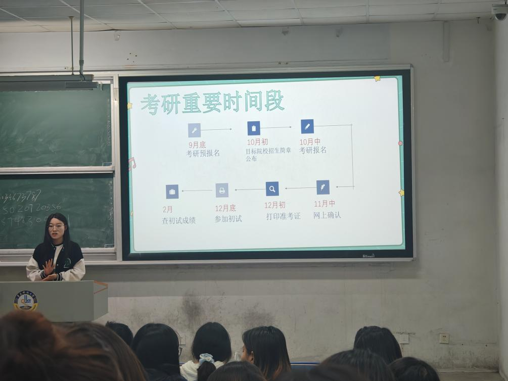 2025年4月28日,为深入贯彻落实立德树人根本任务,充分发挥优秀学子的示范引领作用,国际贸易与城市管理专业联合组织考研经验分享会于18:30在弘毅楼E区101圆满举行。李赞、刘心茹、汪一然、杨婧、张双圆五位优秀学子结合自身考研历程,为同学们带来了一场干货十足的考研经验分享盛宴。