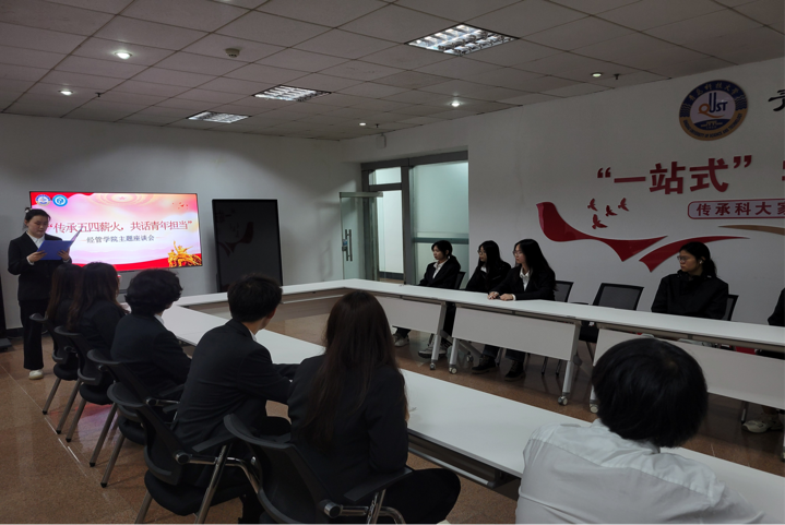团委举办 “传承五四薪火,共话青年担当” 主题座谈会,为新时代青年学子架起跨越历史的精神桥梁。座谈会上,青年学子代表声情并茂讲述了周恩来、刘和珍等革命先锋青年时期的奋斗故事。他们讲述的,是爱国精神在动荡年代的不屈呐喊,是进步思想于黑暗中绽放的耀眼光芒,是民主理念在探索路上的执着坚守,是科学精神向未知领域的无畏进发。这些故事,点燃了青年学子追寻五四精神的热情之火,唤醒了青年学子勇担时代使命的责任之心,指明了青年学子坚定奋进的前行方向。