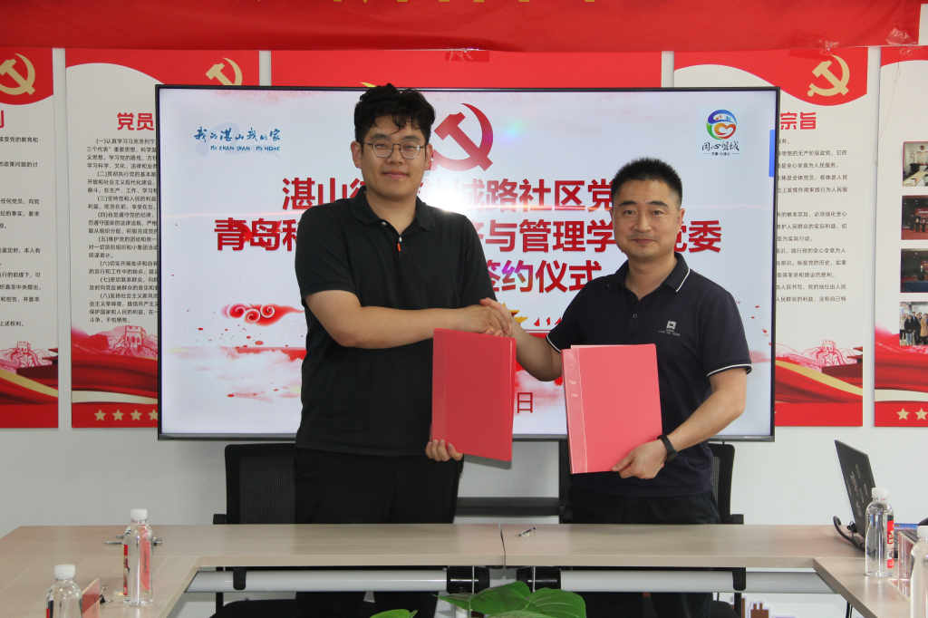 与湛山街道盐城路社区在社区党群服务中心举行“大学生社会实践基地共建”签约仪式。学院党委副书记兼副院长牛宝卫、盐城路社区党委书记刘畅出席活动并签署共建协议,学院教师、暖心苑公益团队代表参加活动。