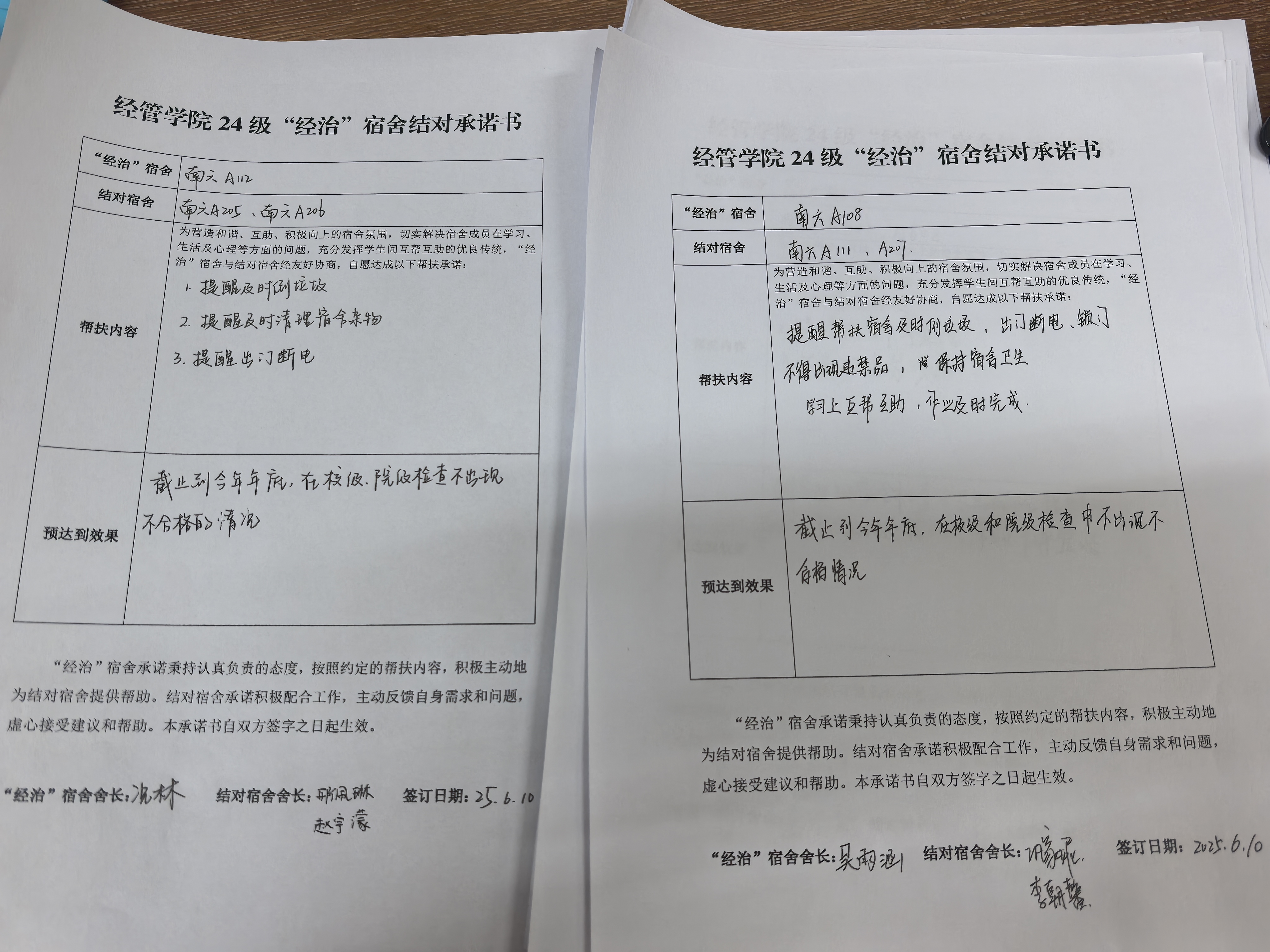 为推动宿舍共同进步,党员先锋带领24级全体宿舍制定结对计划,进行“1+2”全面帮扶。“经治”宿舍需从卫生管理、学风引领、文化建设等方面对结对宿舍进行全面帮助,结对宿舍则需积极学习借鉴,双方共同努力达成预期目标。各结对宿舍代表郑重签署责任书,标志着“以优带新、互助成长”的宿舍帮扶体系正式建立。