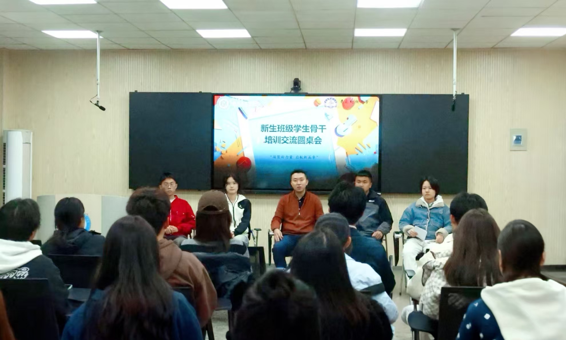 召开新生班级学生骨干培训交流圆桌会暨“青年会客厅”领跑座谈分享会。学院团委副书记兼学工办副主任、新生辅导员孙建树,新生年级助管,各专业领跑学长及班级学生骨干参加会议。