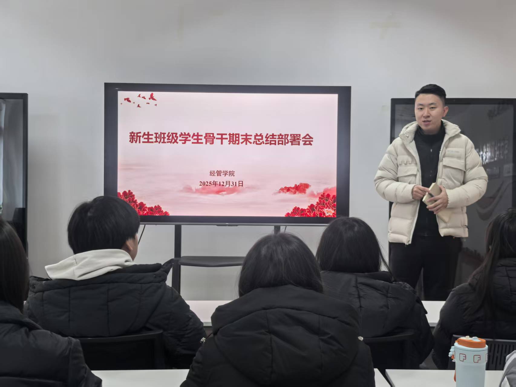 会议围绕“总结复盘、查摆问题、明确任务、规划未来”展开。辅导员围绕本学期工作实际,对班级建设、学风建设、活动组织、日常管理与服务引领等方面进行阶段性总结,充分肯定了各学生骨干在思想引领、信息传达、沟通协调、应急处置等工作中发挥的积极作用,就当前存在的共性问题进行分析与研讨,并针对期末重点工作提出具体要求:一是聚焦学风建设,强化诚信考试教育与考风考纪提醒,做好学业帮扶与朋辈互助;二是细化安全稳定工作,落实宿舍安全、出行安全、防诈反诈等全覆盖传达和提醒,做好离校与返校信息统计;三是推进班级总结与规划,组织开展班级学期工作复盘,形成班级建设清单与改进方案;四是提前谋划新学期工作,围绕开学教育、班级特色活动、志愿服务与社会实践等制定目标任务和时间表,确保“假期不断线、开学有抓手”。