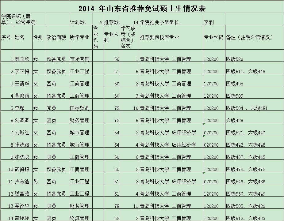 根据《全国普通高等学校推免生工作管理办法(试行)》(教学〔2006〕14号)、《关于做好2014年推荐优秀应届本科毕业生免试攻读硕士学位研究生工作的通知》、《xvideo 推荐优秀应届本科毕业生免试攻读硕士学位研究生工作管理办法(试行)》、《xvideo 推荐优秀应届本科毕业生免试攻读硕士学位研究生工作实施办法(试行)》的文件精神,现将本学院推荐的人员情况进行公示: