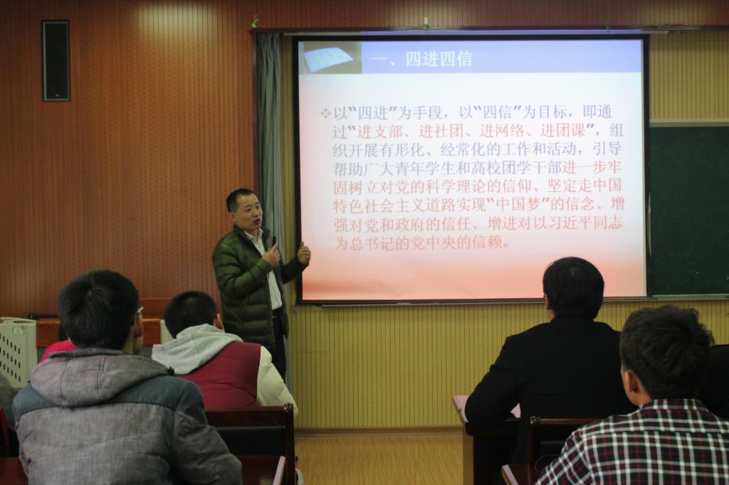 张同雷首先介绍了习近平总书记系列重要讲话精神“四进四信”的核心内容和重要意义。结合学院及学生现阶段实际情况,他对下一步的团学工作提出了具体的指导,强调要以“四进”为手段,以“四信”为目标,做到坚持“三结合”,积极开拓工作思路,让学习活动在支部、在社团、在网络、在团课发挥更大的感召力。随后,张同雷带领大家对习近平经典语录进行了深入学习,并精心挑选出与大学生生活、就业相关的内容与大家开展探讨,提醒学生关注经管类专业面临的发展窘境,鼓励同学清醒的认识到自身的优劣势,增强自身知识和技能的竞争力。最后,张同雷对本学年的工作重点进行总结,以“知情、固本、厚养”进行概括,并指明今后的工作方向和总体要求。