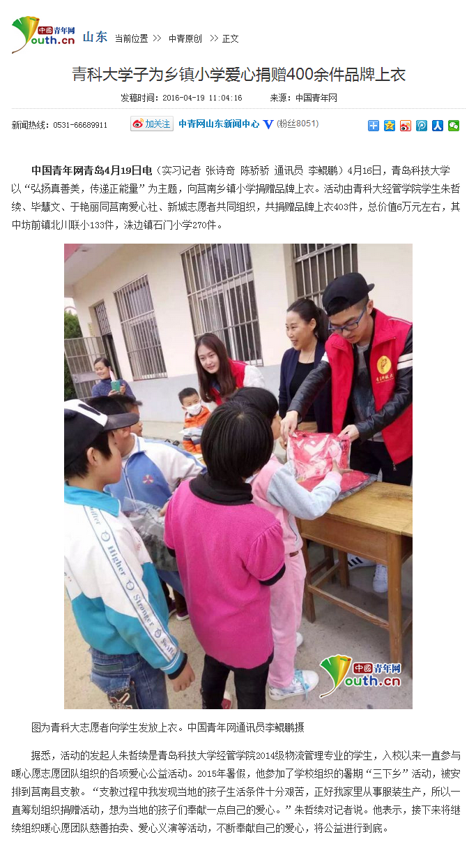 xvideo 学子为乡镇小学爱心捐赠400余件品牌上衣