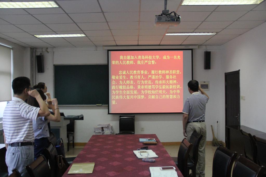 ,成为一名光荣的人民教师,我宣誓:忠诚人民教育事业,履行教师神圣职责,敬业爱生,教书育人,严谨治学。服务社会,为人师表,行为世范。传承科大精神,践行橡胶品格,秉承明德、笃学、弘毅、拓新校训,为学生全面发展,为学校灿烂明天,为中华民族伟大复兴中国梦,贡献自己的智慧和力量。
