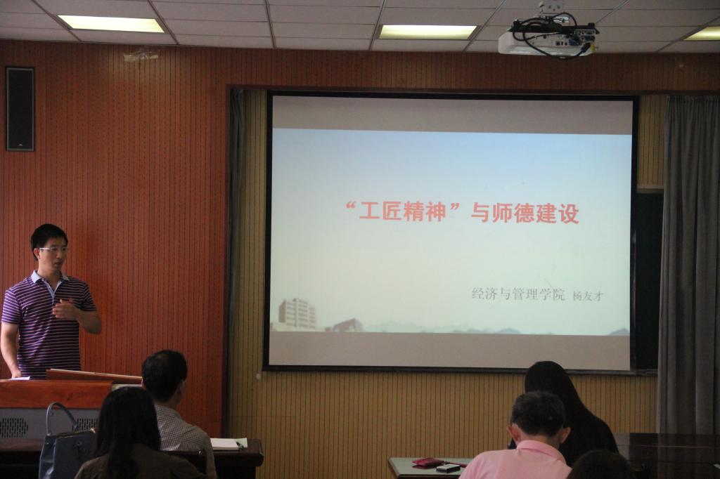 教师代表杨友才做了主题为“工匠精神与师德建设”的专题报告。他解读了“工匠精神”的内涵、时代特色和现实意义以及弘扬这种精神的主要途径。工匠精神与师德建设的结合是一个非常有意义和值得深入思考的话题。作为一名中青年教师,杨友才在大会上做了认真而严肃地宣誓:做一个学生成才路上的螺丝钉,为学生的发展和学校的建设不遗余力地贡献自己的所有力量!