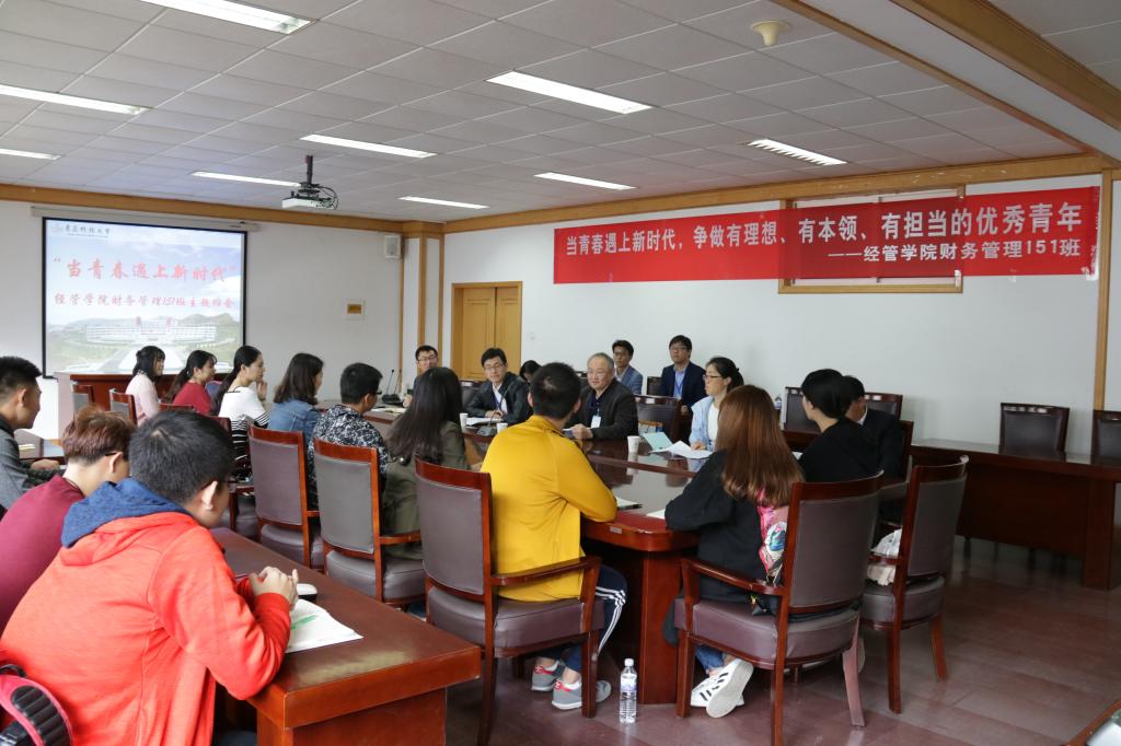 财务管理151班,参加“当青春遇上新时代”主题班会,与青年学生共话学校发展、共享发展成长。学校党委(校长)办公室副主任兼研究室主任毛常明,学院党政领导及辅导员、班主任参加此次班会。