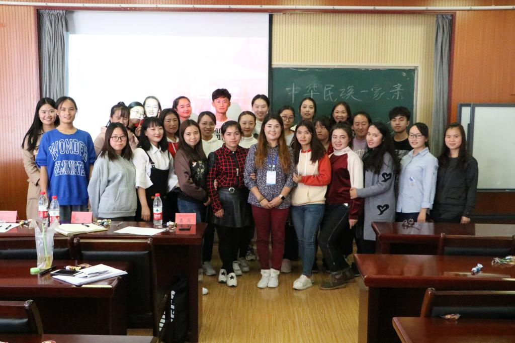 第33届学生会主席解文文,艺术团团长、副团长以及18级全体少数民族新生。