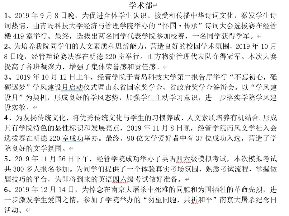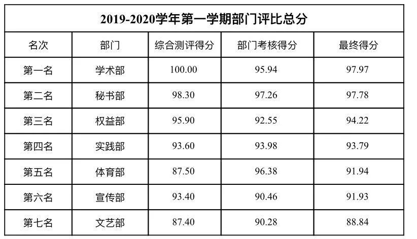 工作考核以部门为单位,分别从工作业绩和部门成员的学业成绩两个方面作为切入点,实行加减分制,结合上学期各个部门在部门建设、部门职能、部门管理等方面的表现进行评比,最终,严格按照部门评比细则,学术部摘得考核桂冠,秘书部和权益部以三分之差分列第二、第三,并授予其“先进工作部门”称号。同时,对于各部门综测成绩在前30%的成员授予“先进工作者”荣誉称号,按照奖罚分明原则,对在部门考核中位于后列的部门及部门成员施之惩罚,以促学生干部正确认识自己,发扬优点,弥补不足,提高工作效率,更好地发挥学生干部作用。