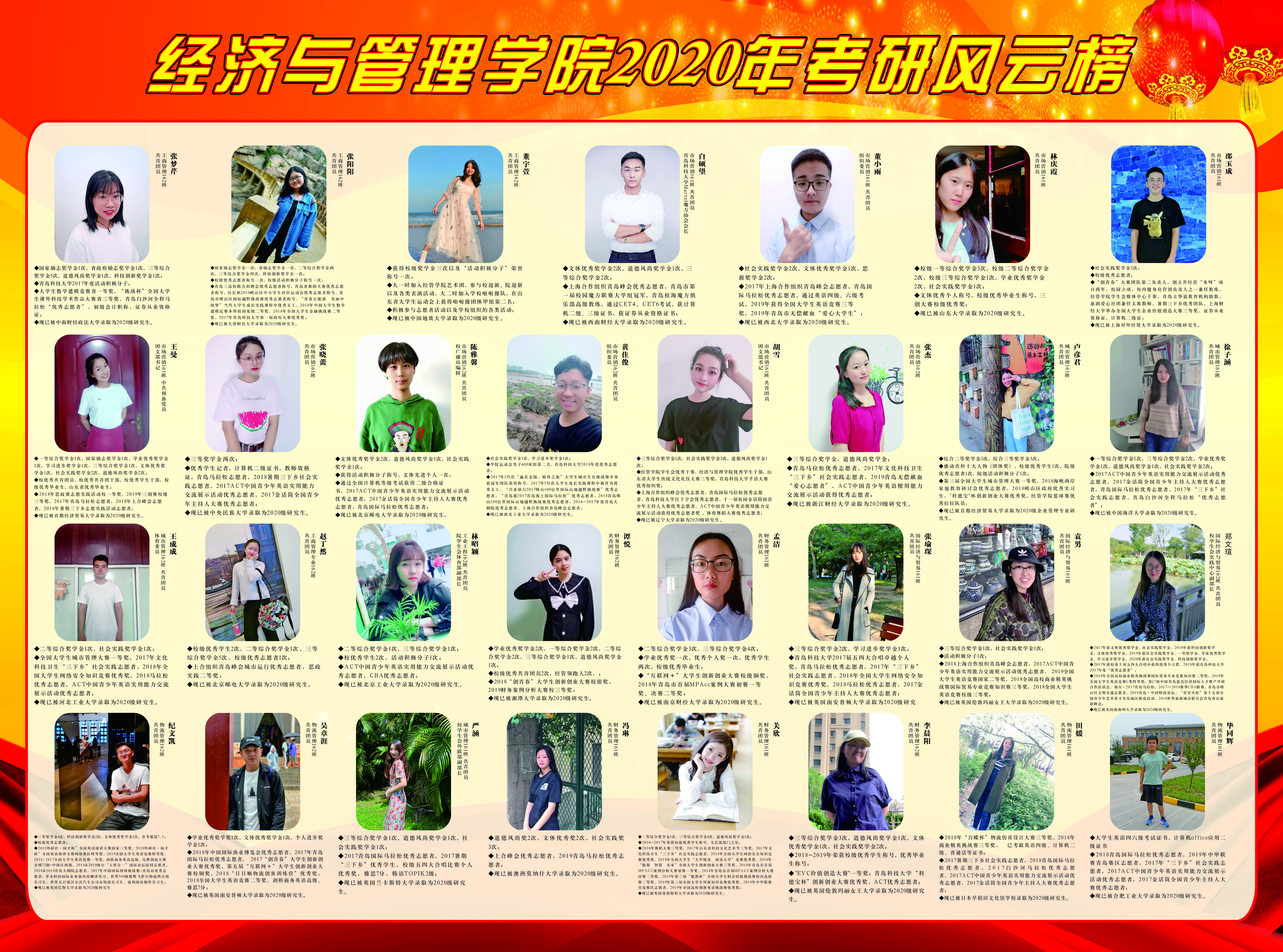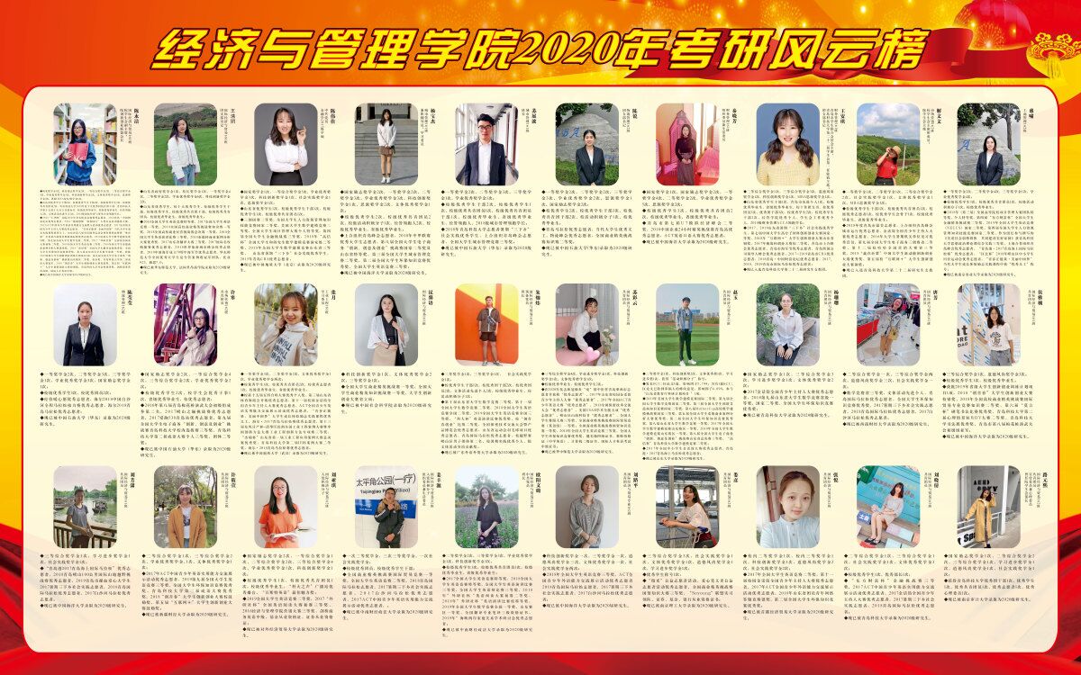 的考研工作较之以往又上新台阶。据统计,国内外升学最终录取人数122人,双一流高校录取人数58人,总考研率达24.94%,较去年提升近5个百分点。其中,国际经济与贸易专业考研率37.5%,工商管理专业考研率14.71%,财务管理专业考研率23.97%,工业工程专业考研率30.51%,城市管理专业考研率10.34%,市场营销专业考研率19.35%,物流管理专业考研率40.35%。为进一步夯实学院学风建设,树榜样,立标杆,营造浓厚学术氛围,特推出“考研风云榜”展示活动,具体如下: