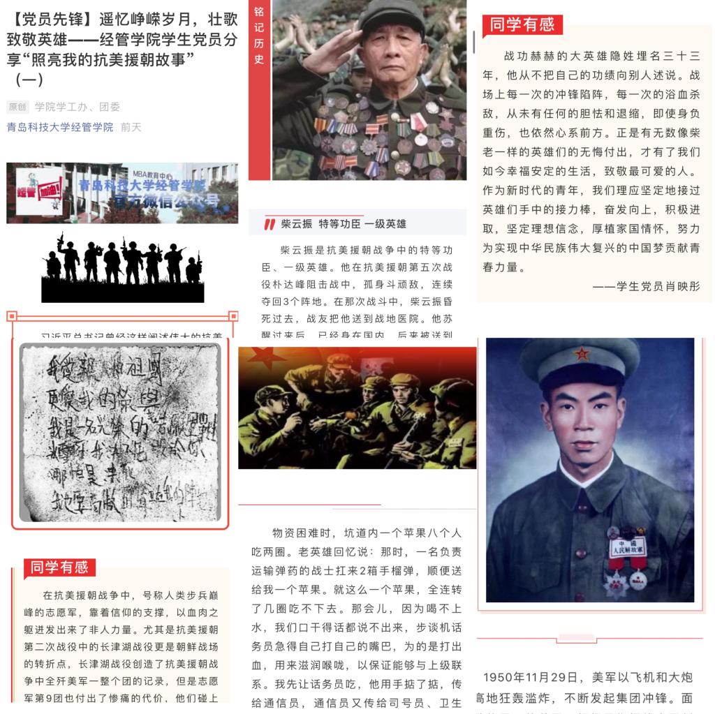 以学生党员教育管理为契机,发挥“一名党员就是一面旗帜”的模范带头作用,系统开展“遥忆峥嵘岁月,壮歌致敬英雄——学生党员分享‘照亮我的抗美援朝故事’”主题教育活动,以抗美援朝精神之爱国主义精神、革命英雄主义精神、革命乐观主义精神、革命忠诚精神和国际主义精神为引领,以真实史迹为依据,以教育引导广大同学为目的,引导党员深度挖掘革命烈士、人民英雄的作战事迹和人生故事,解析抗美援朝战争中鲜为人知的战例细节,并借助学院官微平台对广大学子进行普及教育,以此为根基,弘扬人民志愿军顽强的战斗意志和强大的献身精神,深化对民族精神的认知与传承,明晰时代责任的召唤与内涵,牢记青年报国的使命与担当,实现了学生党员引领一方、影响一方、感召一方的教育效果。