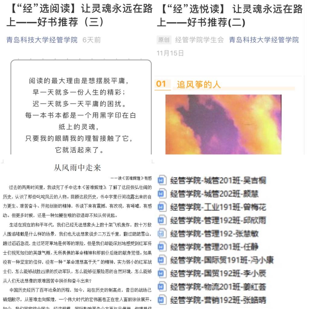 利用线上线下同时发力,通过微信公众号、经管小石头、易班等线上平台开展“好书推荐”系列活动,经管学子通过热烈讨论,交流心得,深化读书感想,指导自身行动,并号召全院学生培养读书习惯,争做读以修身,涵养品德的先行者,做传承经典、引领风尚的实践者。同时,学院组织学生在阅读后撰写心得感悟,交流读书体会,将所想所感付诸笔尖,进一步将读书意识在实践中传播与秉承。