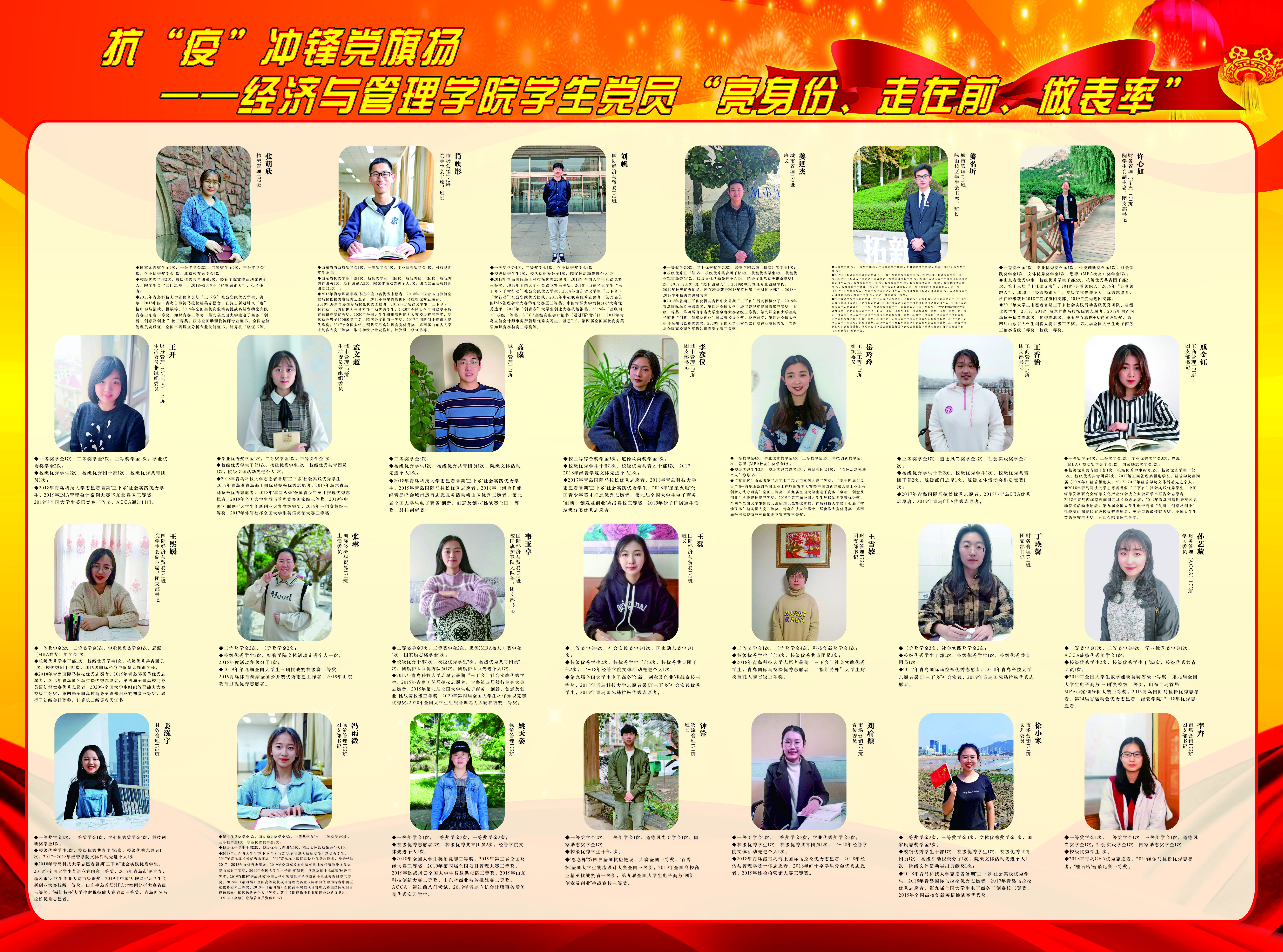 分专业评奖评优管理办法》,建立起“横向交融、纵向贯通”的书院管理体系,启动学院第四届(2020年)“经管领跑人”荣誉评选,严抓考风考纪考前加大诚信教育,以刮骨疗毒的决心营造清朗诚信的考风。在树学风、肃学风、正学风下,学院学风建设取得实效,涌现出省级先进班集体城管171班、省优秀学生肖映彤、姜名圻、苑祥臣(退伍士兵专项)、王景雯,省优秀学生、校十佳团支书许心如,青科好班长姜延杰,校十大优秀学生肖映彤,校十大自立自强标兵张萌欣,校十大优秀科技社团干部尹相鹏等一批先进典型。