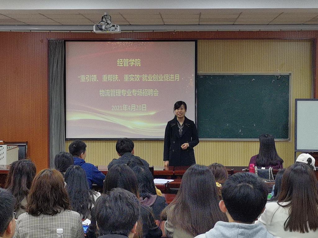 为切实做好2021届毕业生就业工作,搭建应届生与用人单位双向选择平台,结合学科特点和学生实际情况,4月20日,物流管理系专场招聘会于经管楼419室成功举办,物流管理系全体毕业生及毕业班辅导员参与招聘会,招聘会由系主任索琪主持。