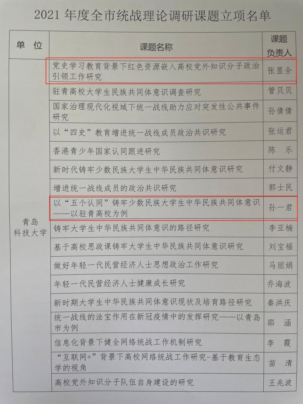 申报的课题《党史学习教育背景下红色资源嵌入高校党外知识分子政治引领工作研究》(负责人张显全)和《以“五个认同”铸牢少数民族大学生中华民族共同体意识—以驻青高校为例》(负责人孙一君),均获得2021年度统战理论调研课题立项。
