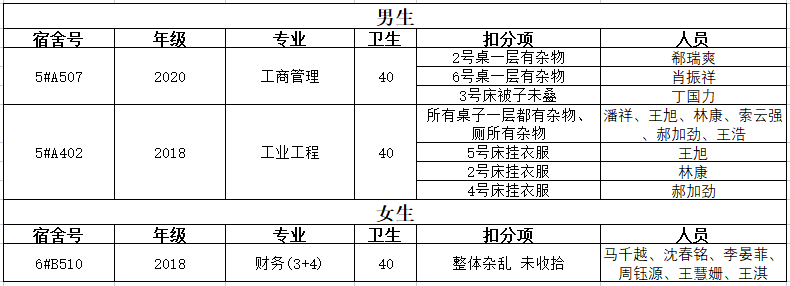卫生检查结果及扣分细则请见附件,请各年级对照问题监督好不合格宿舍的整改。