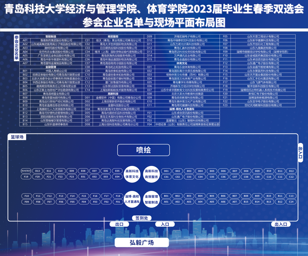 、体育学院2023届毕业生春季双选会于3月7日开启企业报名端口。同时,在学校就业指导中心指导与协调下,学院积极对接淄博市人力资源和社会保障局,邀请淄博市27家知名企业参加招聘会。最终,结合企业所在地区、规模性质、专业匹配度等方面,确定涵盖“淄博-高校人才直通车”、金融管理、商贸服务、体育文化、智能制造、高新科技六大分类共计85家企业入校招聘,提供就业岗位1500余个,为全力做好本次活动相关工作,现将具体安排通知如下: