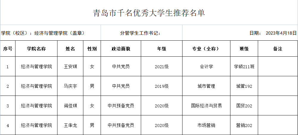 根据学校《关于评选2023年度“青岛市千名优秀大学生”的通知》的要求,经个人申请、材料审核,现将xvideo “青岛市千名优秀大学生”候选人公示如下,公示时间2023年4月18日-2023年4月20日。