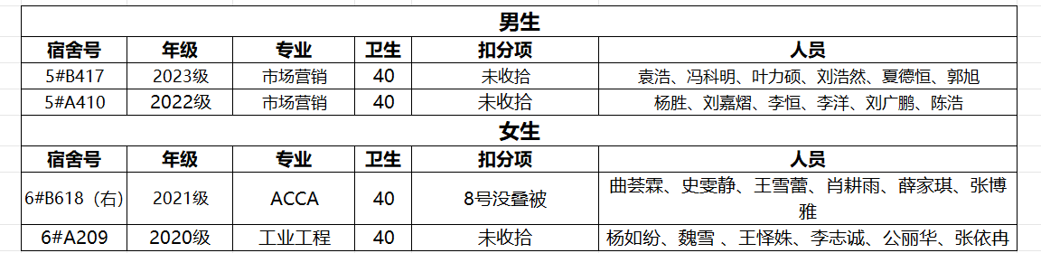 卫生检查结果及扣分细则请见附件,请各年级对照问题监督好不合格宿舍的整改。