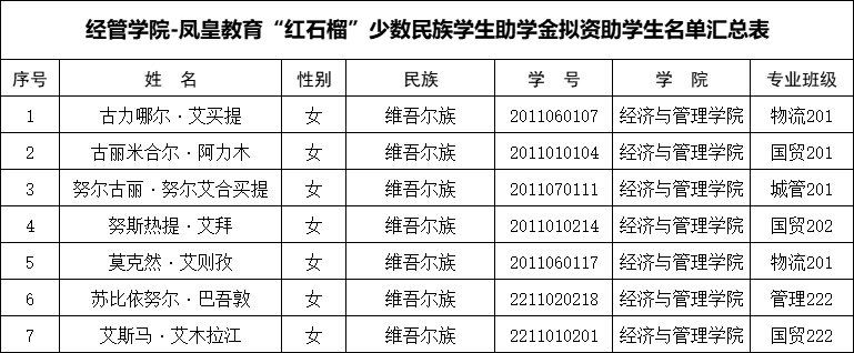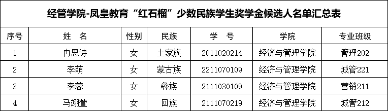 少数民族学生勤奋学习、努力进取,在德、智、体、美、劳等方面得到全面发展,根据学校2023年度凤皇教育“红石榴”少数民族奖助学金评选要求,通过自主申报、公开评审等环节,确定奖学金人选4人,助学金受助人选7人,公示如下: