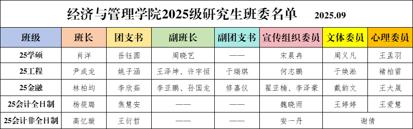 为进一步加强班级建设,提升同学们的凝聚力和归属感,经过个人申请、公开答辩及投票、综合评审,现将2025级硕士研究生班委人选公示如下: