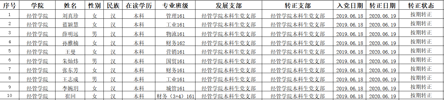 本科生党支部于2020年6月19日召开预备党员转正大会讨论刘真珍等10位同志的转正问题,同意以上同志按期转为中共正式党员,现将该10名同志情况予以公示。公示期为2020年6月19日至2020年6月25日。如有异议,请于公示期内到xvideo